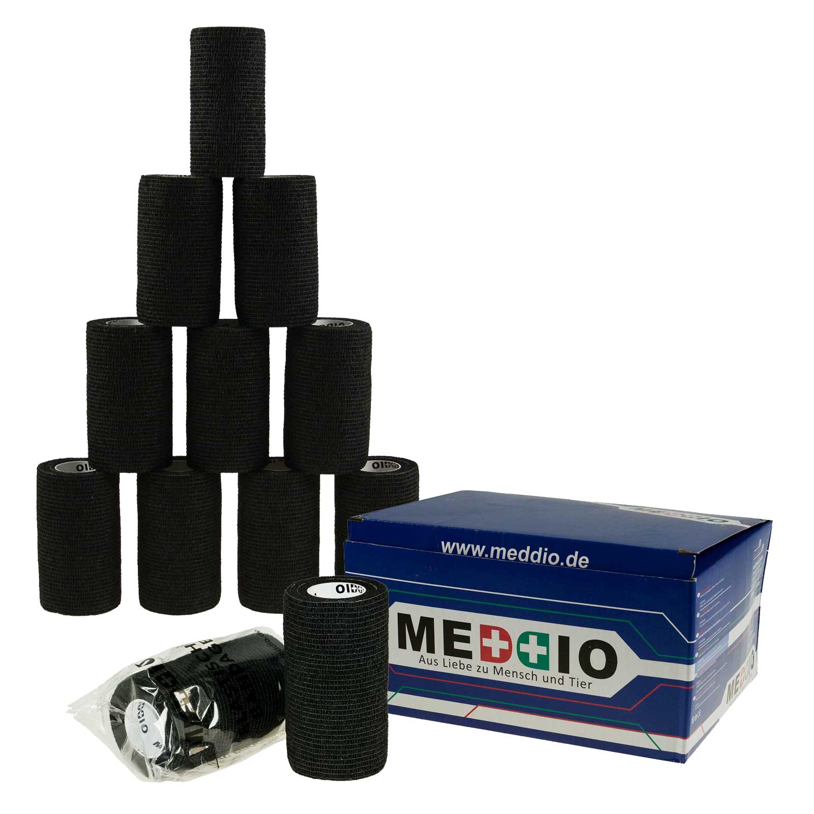 Die meDDio Haftbandagen eignen sich hervorragend als Stützbandage, zur Wundversorung und Prävention vor Verletzungen. Sie sorgen für eine Schonung und somit schnelle Regeneration bei Verletzungen an Sehnen und Bändern. Der innovative selbstklebende Fixierverband ist besonders stark strapazierbar. Die elastischen Bandagen sind selbsthaftend, verkleben aber nicht mit Haaren, Haut oder Wunden. Auch nach dem Anlegen lässt sich die Bandage wieder einfach lösen und ggf. in der Stärke und Breite korrigieren.