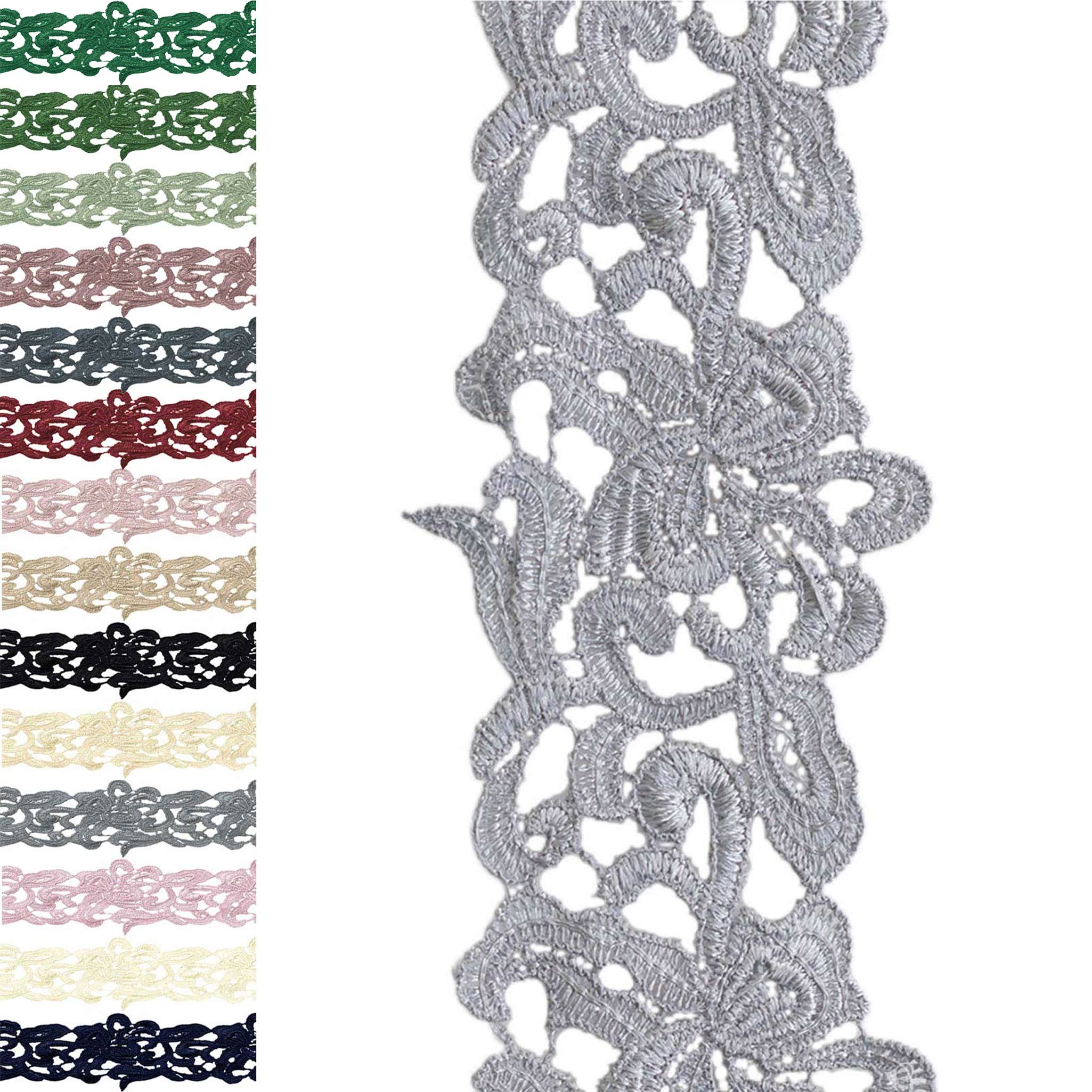 Diese edle Spitzenborte ist präzise gefertigt und hat markantes Ornament-Design. Bestens geeignet zum Verzieren von Kleidern, Röcken, Blusen und Hosen, aber auch sehr interessant für Tischdecken, Dekokissen und andere Wohnraum Accessoires.