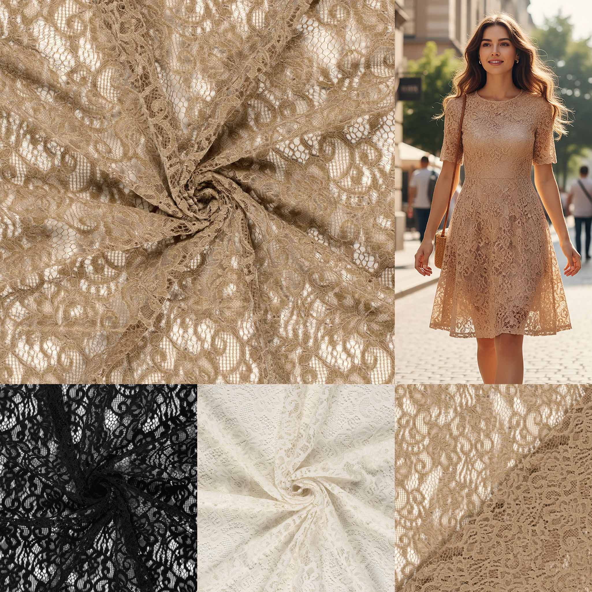 Lass Deine Nähideen erblühen: Dieser florale Spitzenstoff verwandelt jedes Projekt in ein stilvolles Highlight. Das feine Blumenmuster verleiht Kleidern, Blusen oder Accessoires Tiefe und Leichtigkeit zugleich, während der weiche Griff ein luxuriöses Tragegefühl bietet. Mit einer Breite von ca. 150 cm hast Du genug Stoff, um Deine kreativsten Ideen umzusetzen – ob elegante Mode oder dekorative Wohnideen.