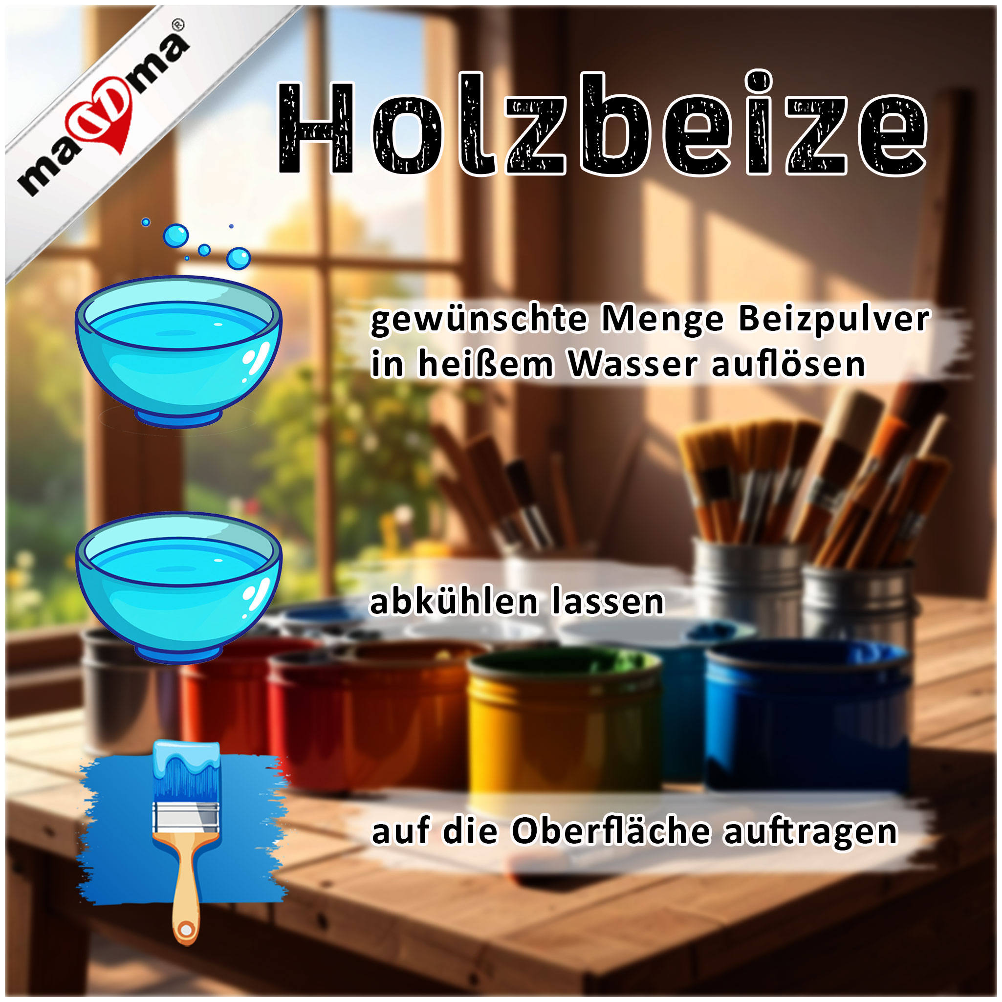 Mit unserer hochpigmentierten Holzbeize in Pulverform verleihst Du Deinen Möbeln, Türen, Dekoartikeln und vielem mehr eine individuelle Note. Egal ob Du Deine alten Möbelstücke aufpeppen oder neue Projekte umsetzen möchtest – unsere Beize bietet dir unzählige Möglichkeiten.