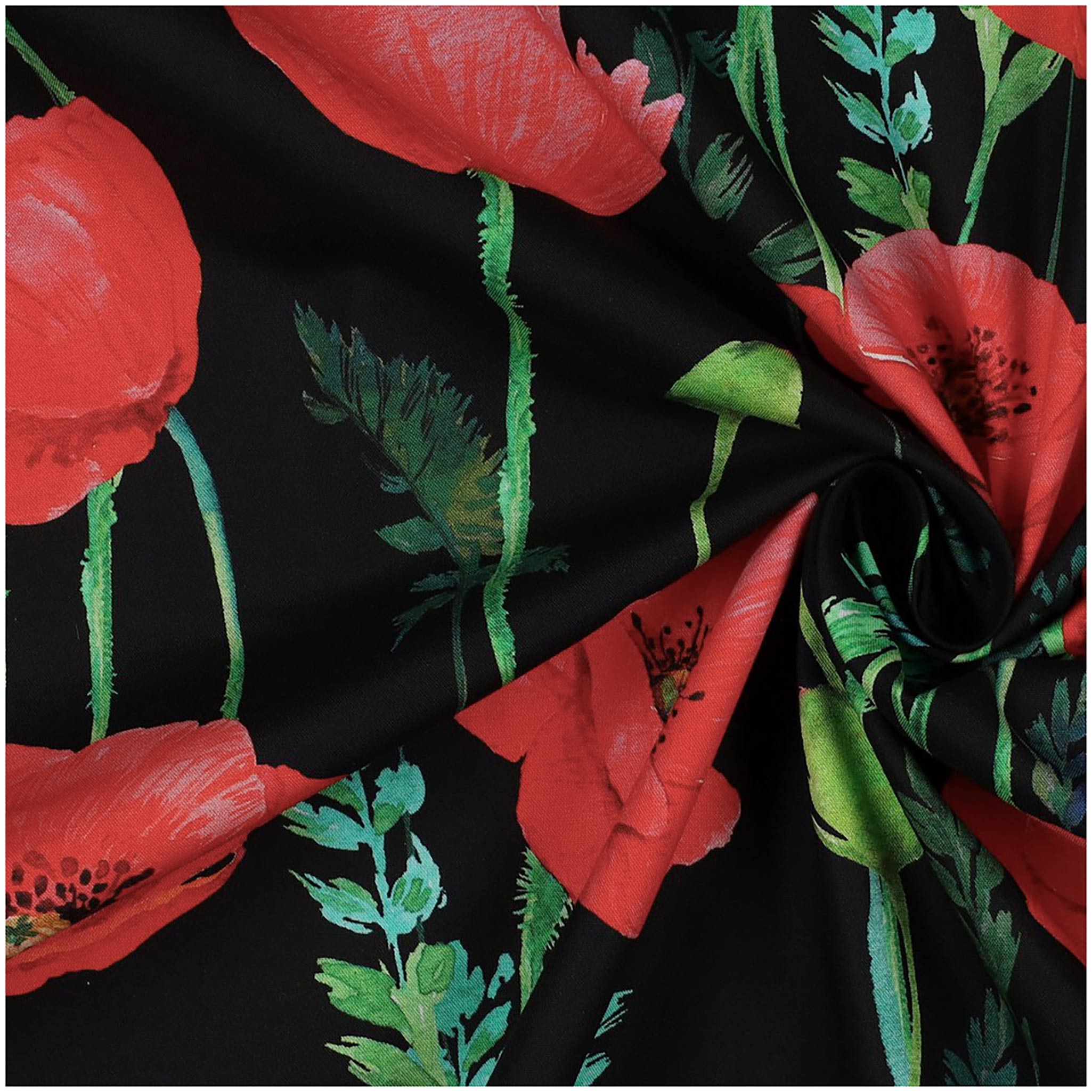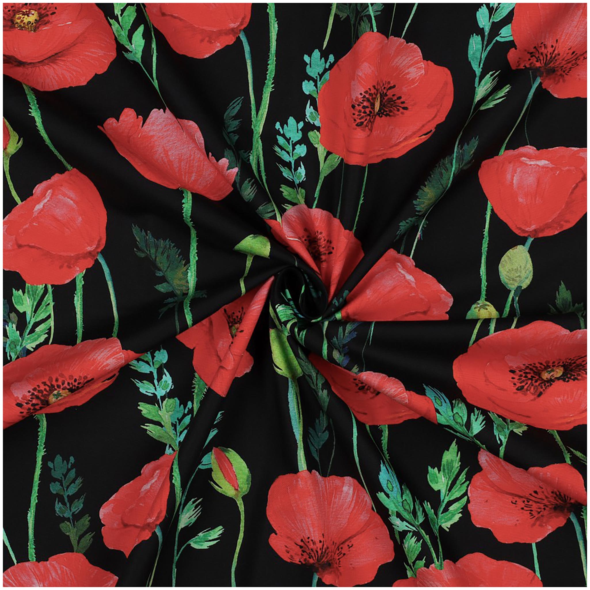 - Dieser schöne Baumwollstoff hat ein tolles Muster mit Mohnblumen auf einem schwarzen Hintergrund. Er ist super für alle deine Nähideen, egal ob du Kleidung für dich und deine Freunde machen möchtest, dein Zuhause mit selbstgenähten Kissen oder Vorhängen verschönern willst.