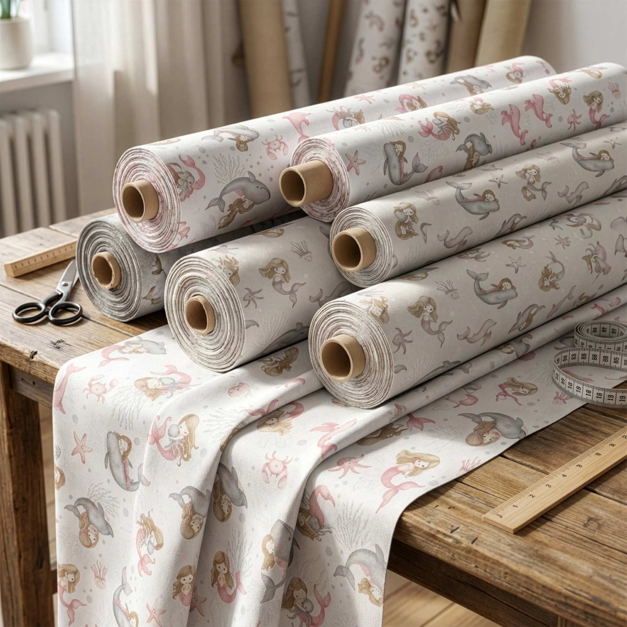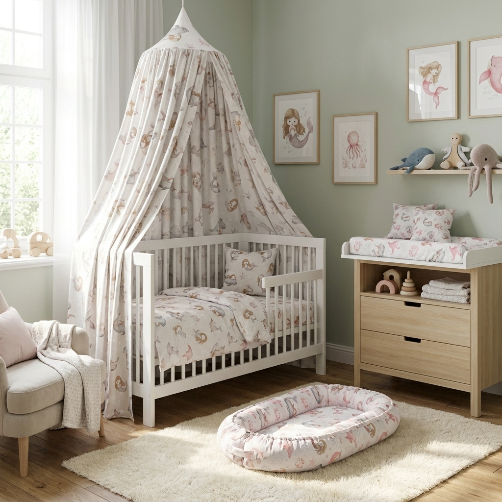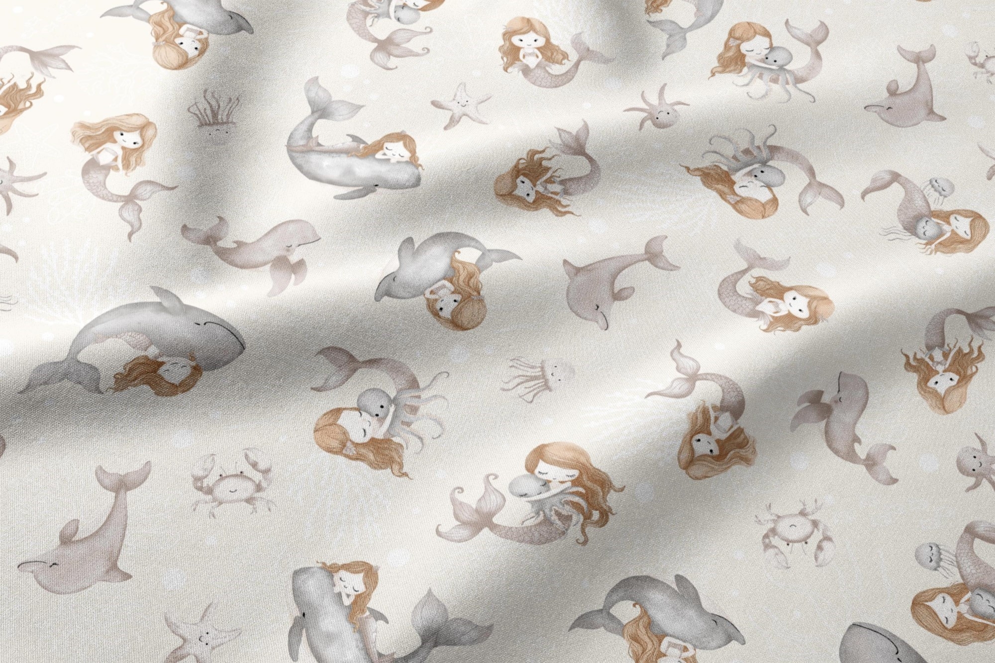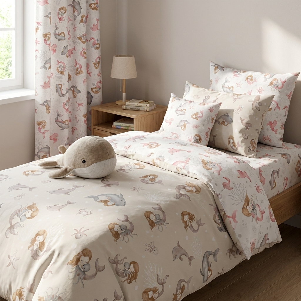 • Liebevolles Design: Zarte Meerjungfrauen, Wale und maritime Motive in ruhigen Farben – perfekt für stilvolle Kinderstoffe ohne grelle Optik.