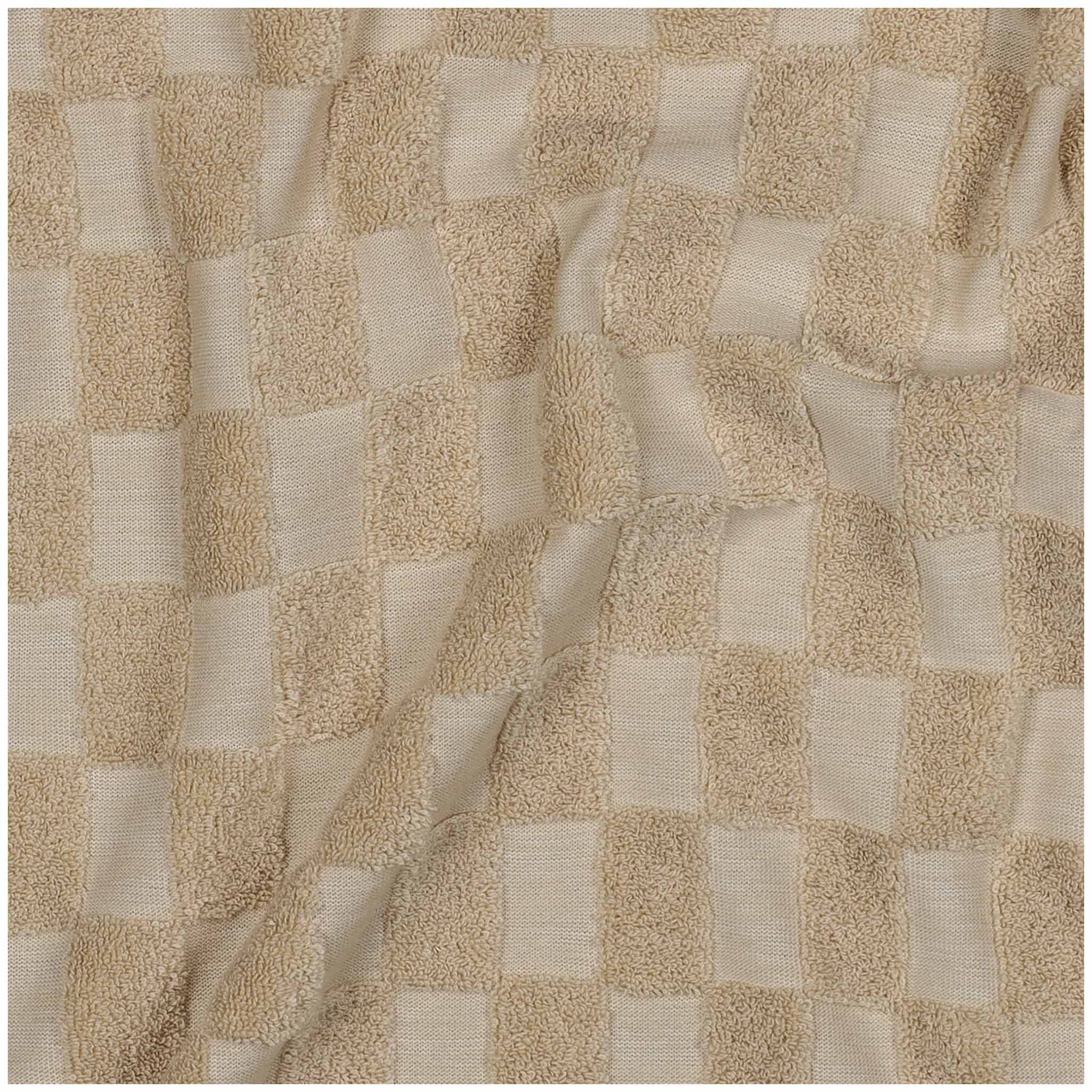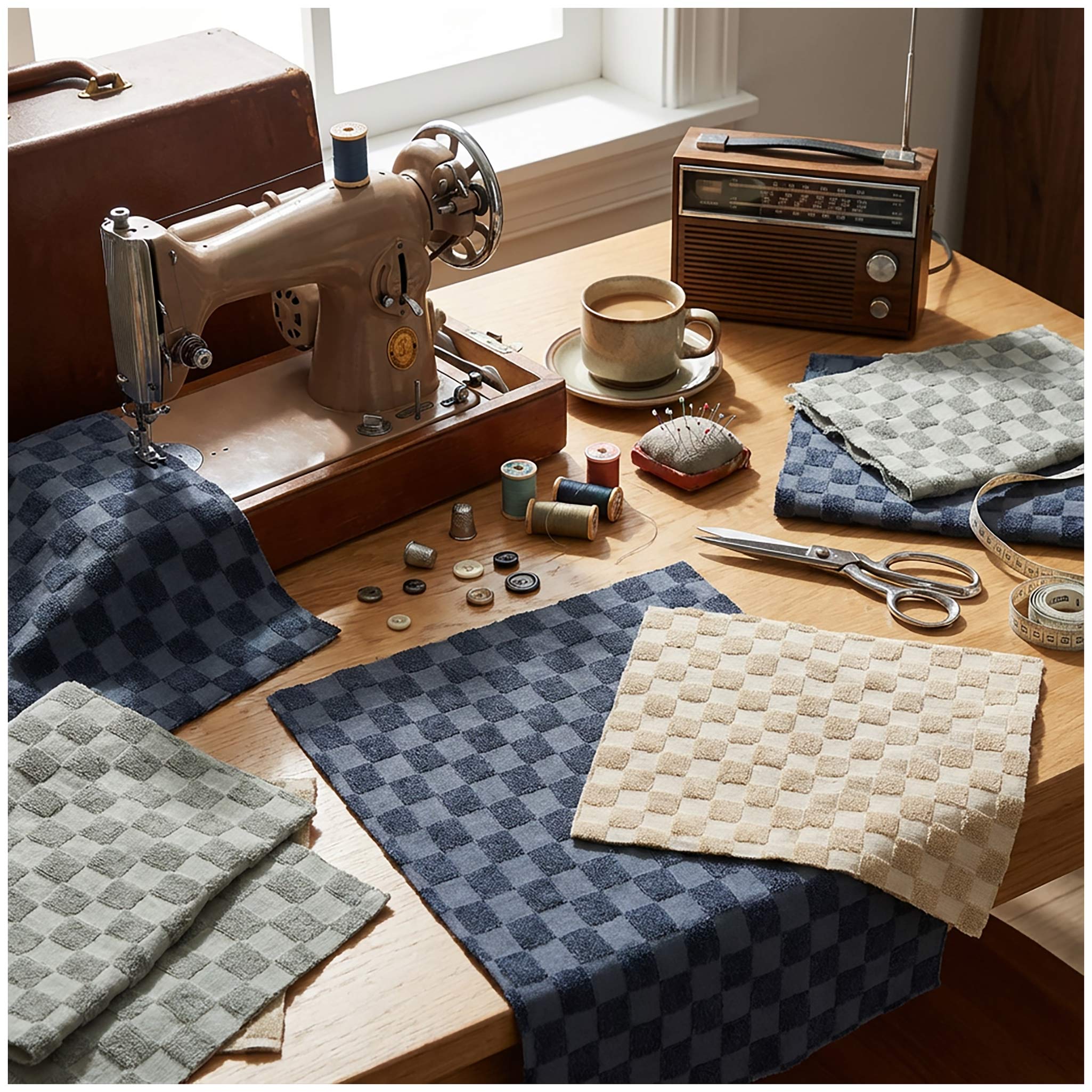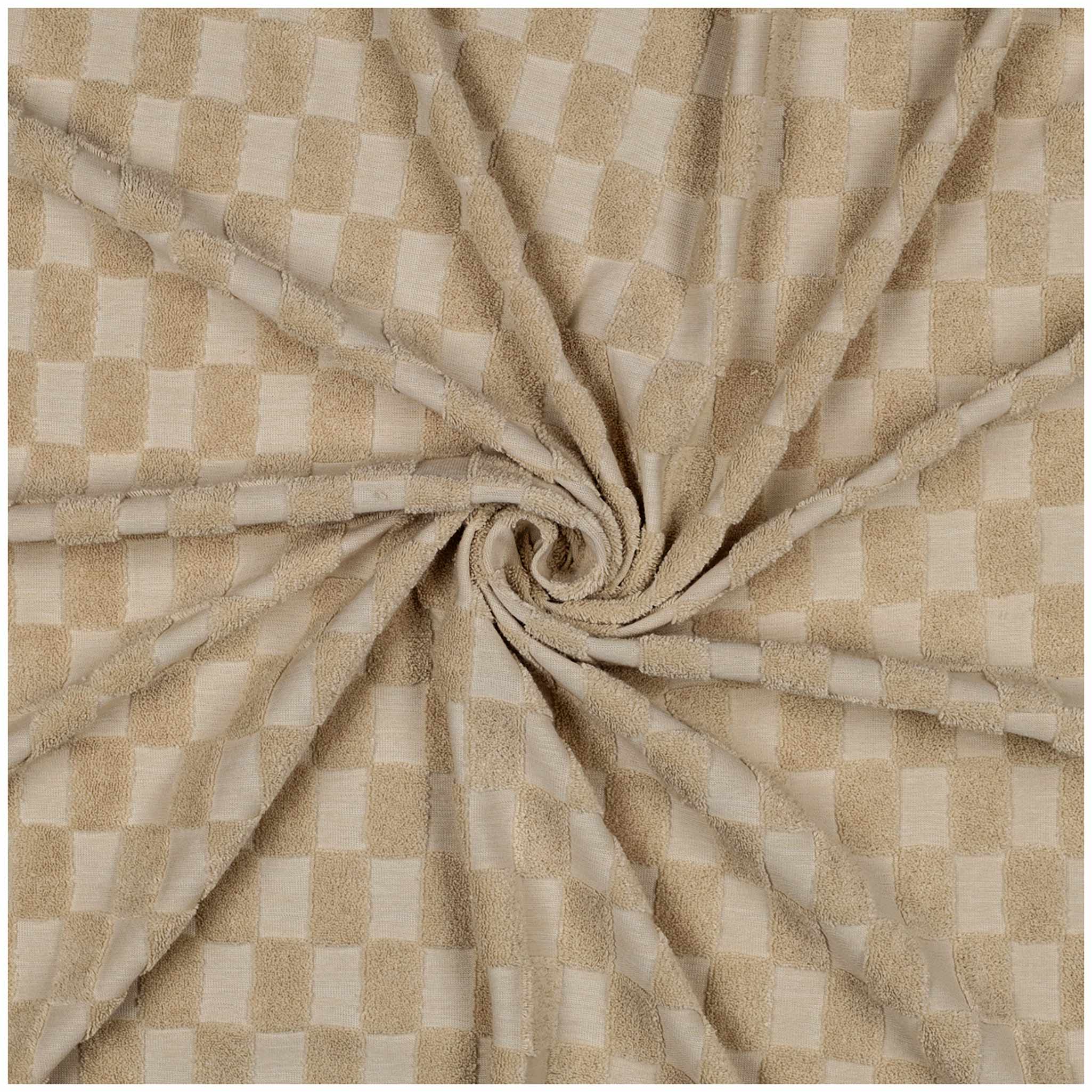 Dieser Stoff definiert den Begriff Luxus-Frottee neu. Die spezielle Jacquard-Webart erzeugt ein changierendes Karomuster, das nicht gedruckt ist, sondern durch den bewussten Wechsel von Frotteeschlingen und flachen Bereichen entsteht. Das verleiht dem unifarbenen Stoff eine bemerkenswerte Haptik und visuelle Tiefe. Mit einer angenehmen Grammatur von ca. 250 g/m² ist der Stoff voluminös und griffig, ideal für alles, was sich nach Komfort anfühlen soll.