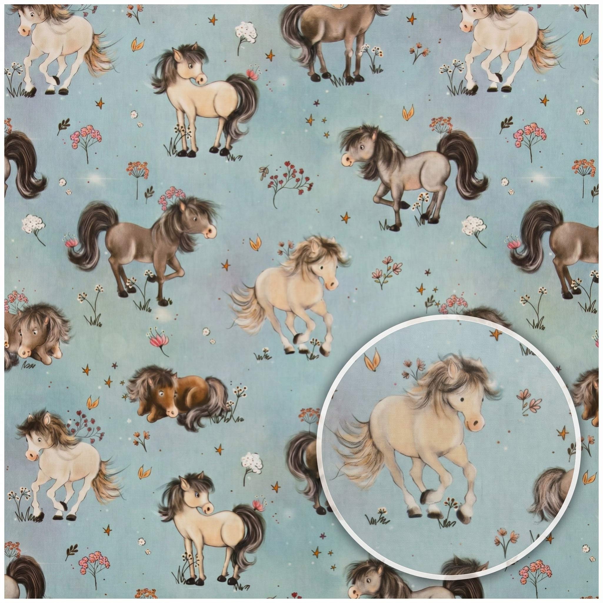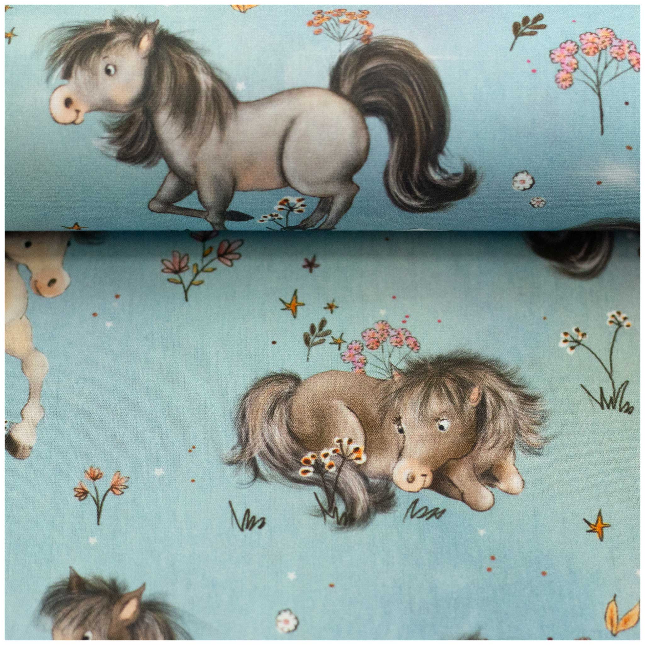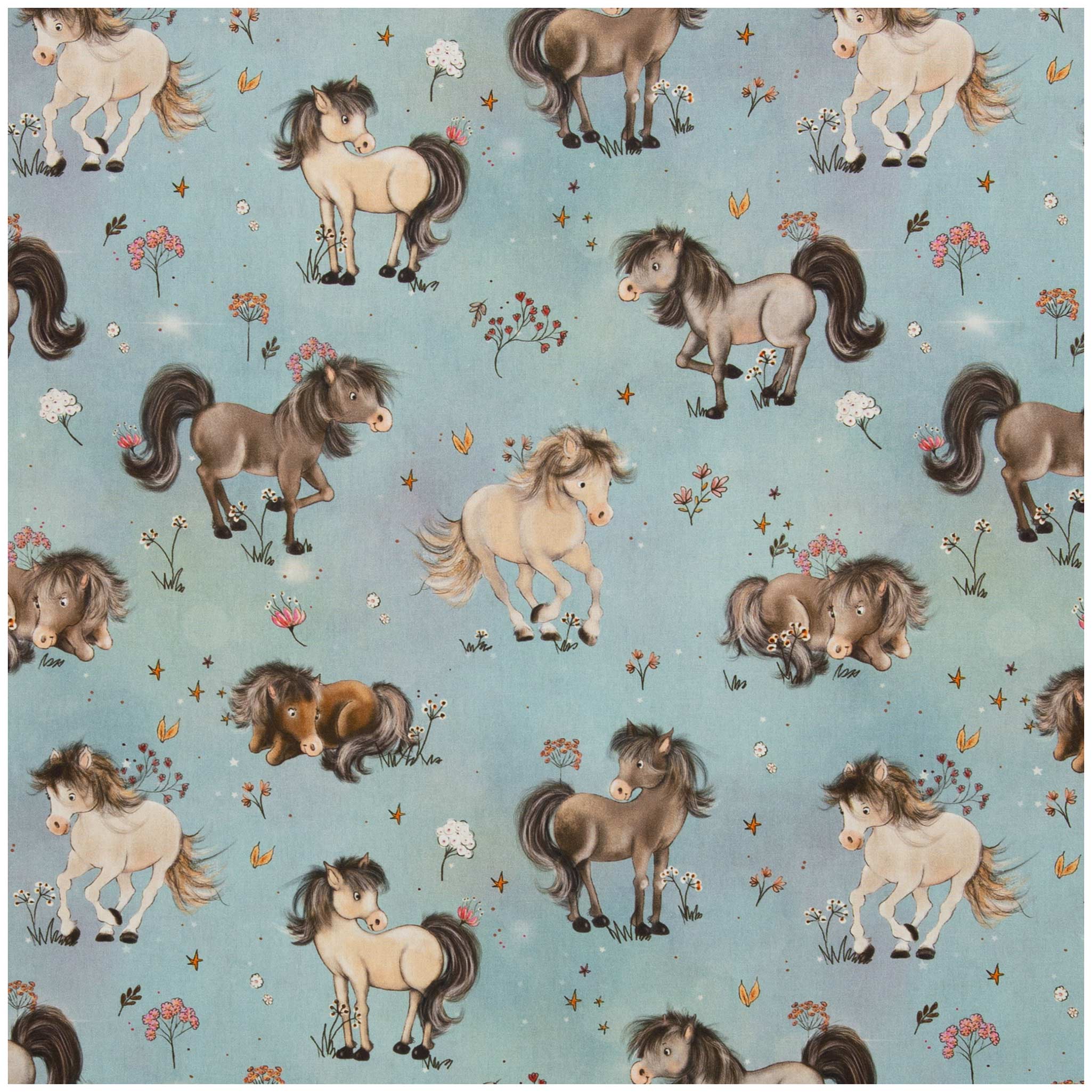 Kennst du das Gefühl, wenn ein Stoff beim Auspacken schon die erste Geschichte flüstert? Diese Ponys sind irgendwo zwischen einer wilden Blumenwiese und einem Tagtraum zu Hause. Der blaue Grundton? Wie ein wolkenloser Moment direkt nach einem Regenschauer. Und mittendrin tummeln sich Pferde mit Mähnen im Wind, umringt von zarten Blüten und Sternenstaub, der aussieht, als hätte ihn jemand ganz beiläufig zwischen die Hufe gestreut. Es ist eine eigene kleine Welt – leise, verträumt und voller kleiner Geheimnisse, die man erst beim zweiten Blick entdeckt.