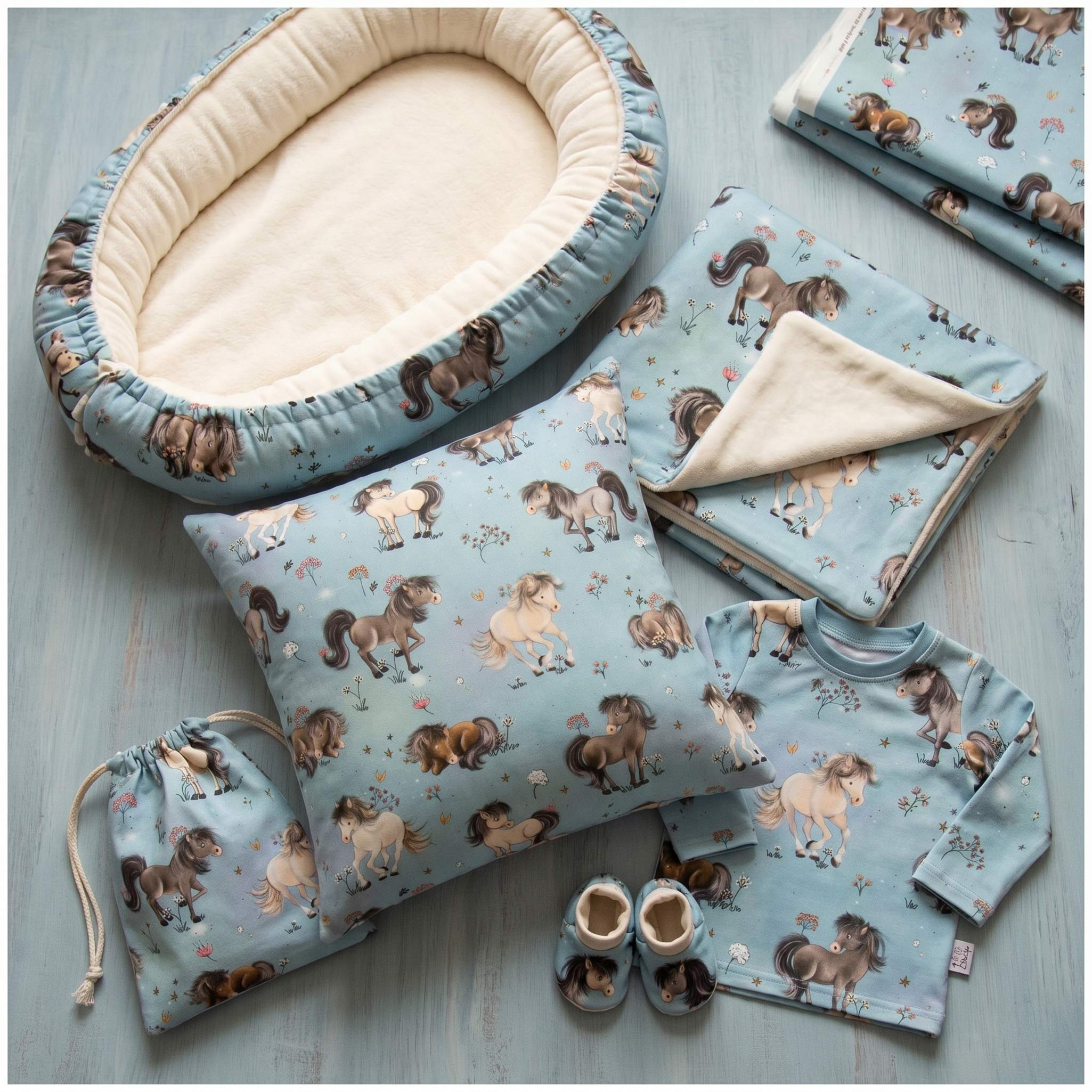 - Illustrationen mit Seele: Vergiss starre Muster – hier hat jedes Pony eine eigene Persönlichkeit. Durch die feinen, handgezeichneten Details und die sanften Pastellverläufe wirkt der Print eher wie ein Kunstwerk auf Stoff als wie ein simpler Druck.