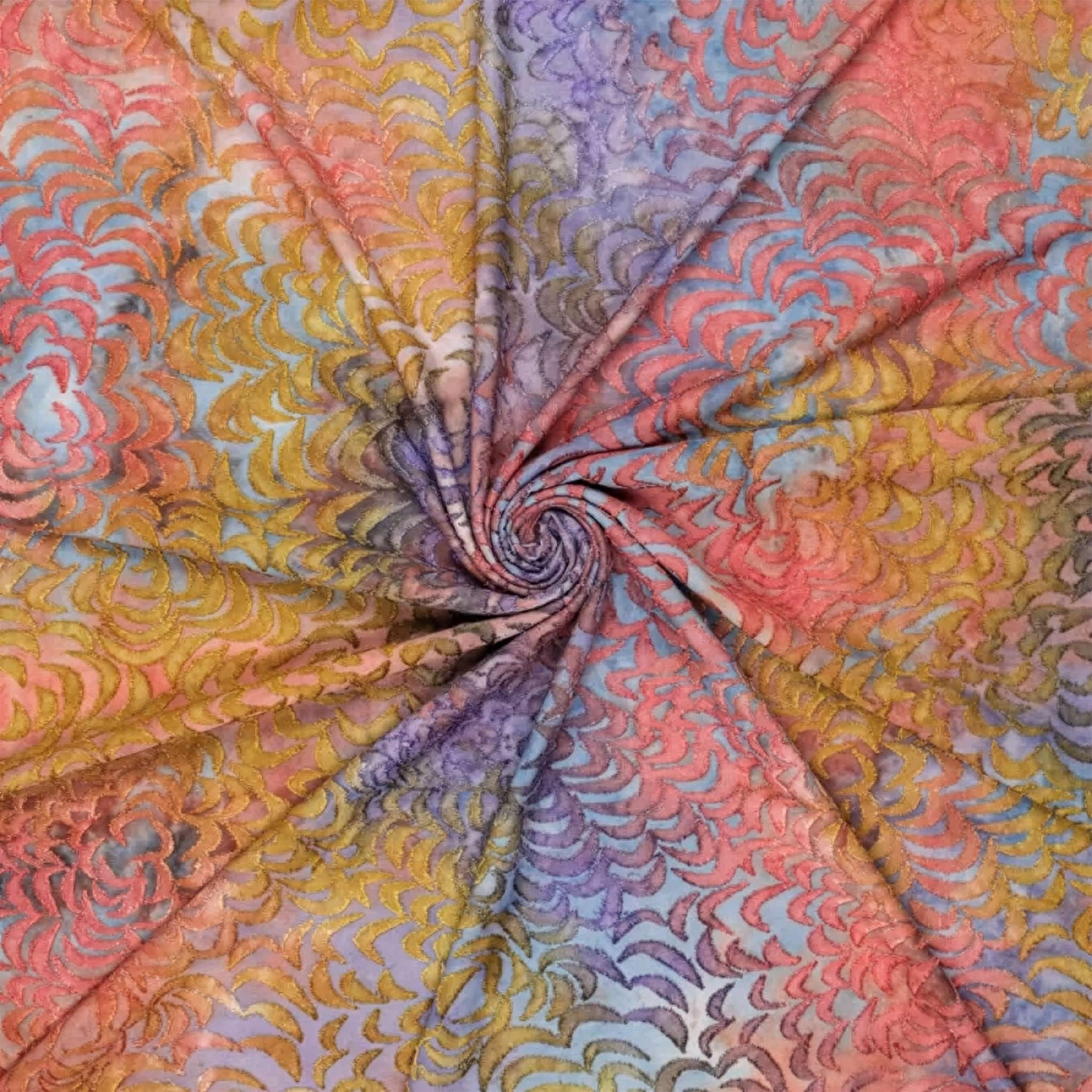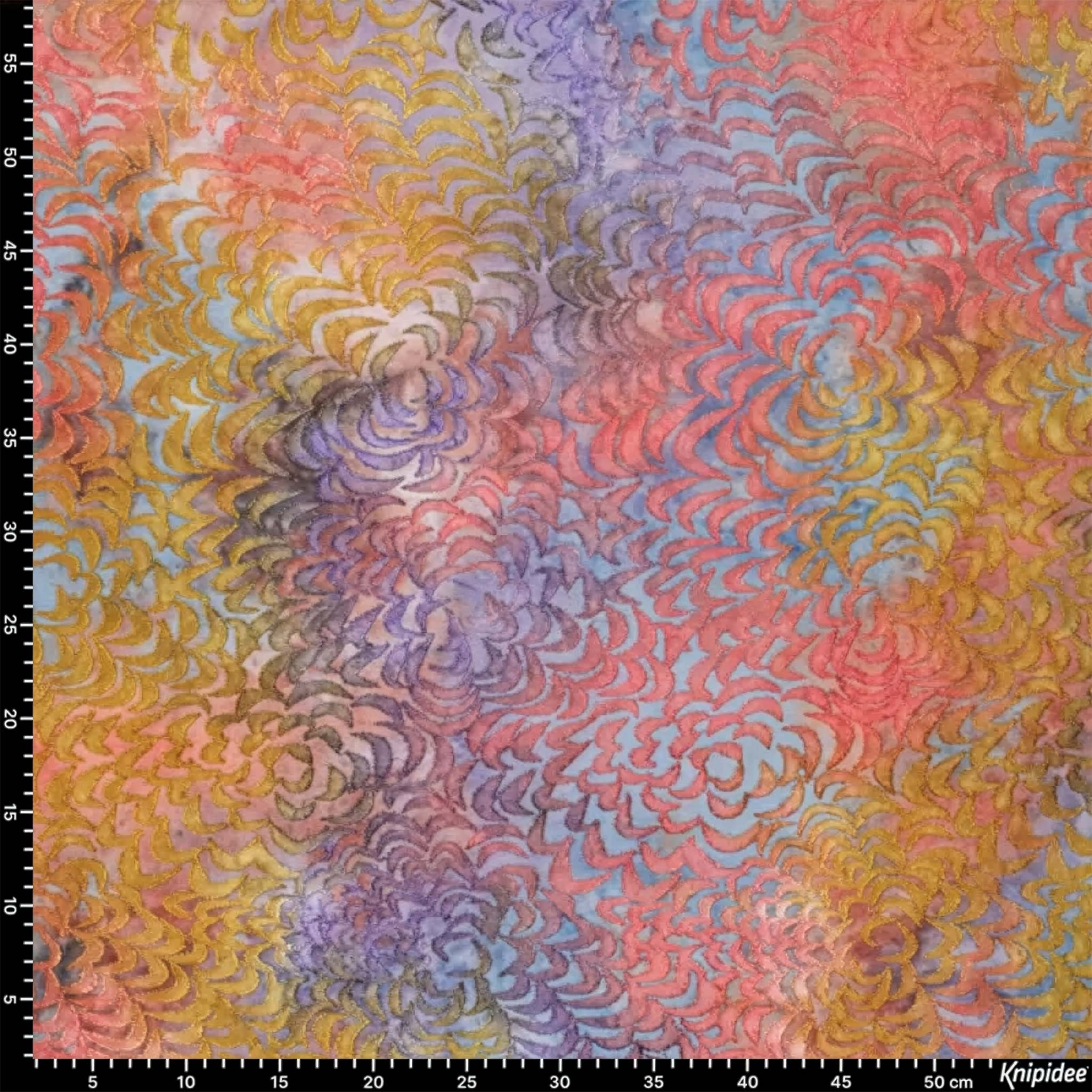 Bringe zauberhafte Farben in deinen Kleiderschrank! Dieser exklusive Sommerstoff kombiniert ein modernes Batik-Design mit einem dynamischen, abstrakten Wellenmuster. Das harmonische, bunte Farbenspiel macht jedes deiner Nähprojekte zu einem echten Unikat.