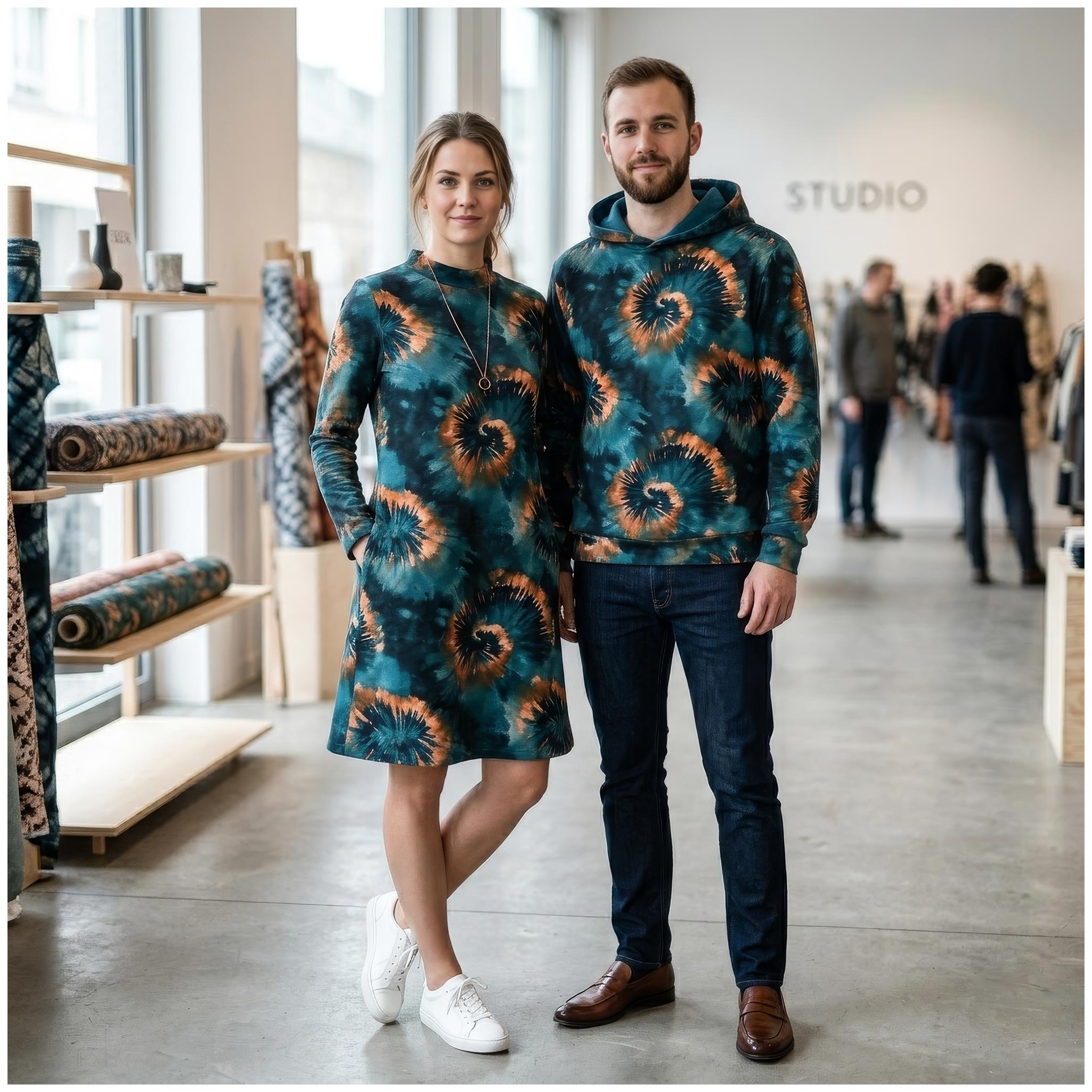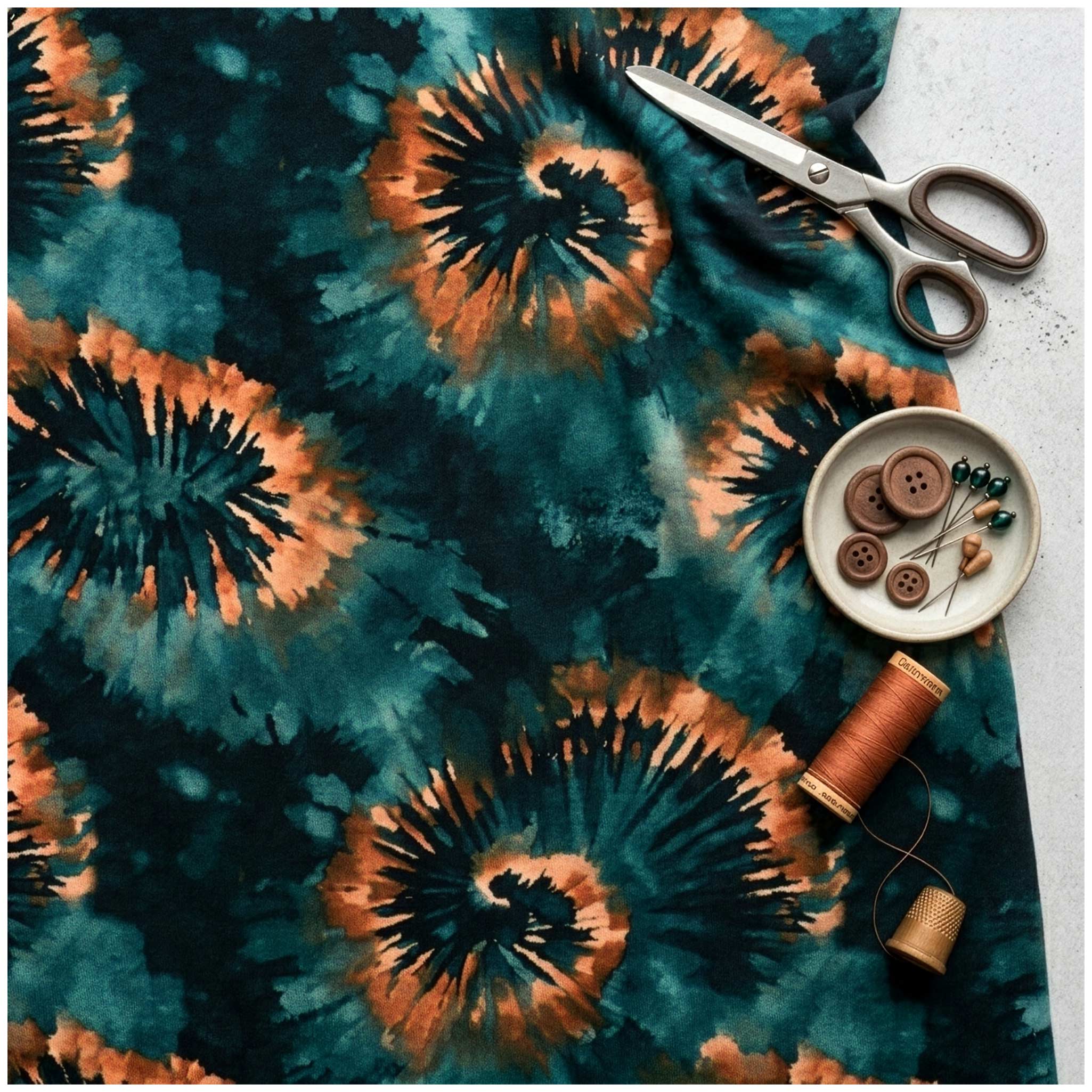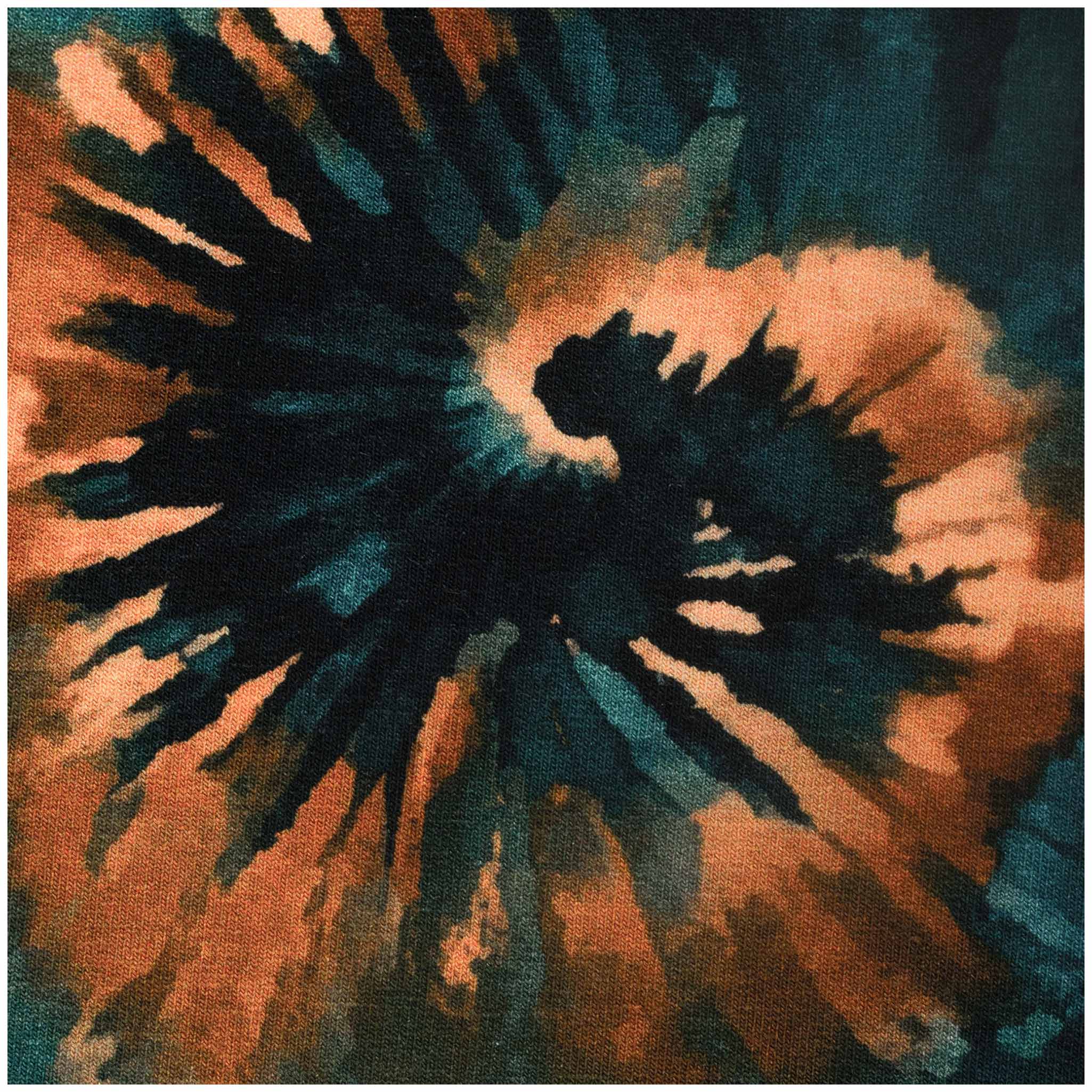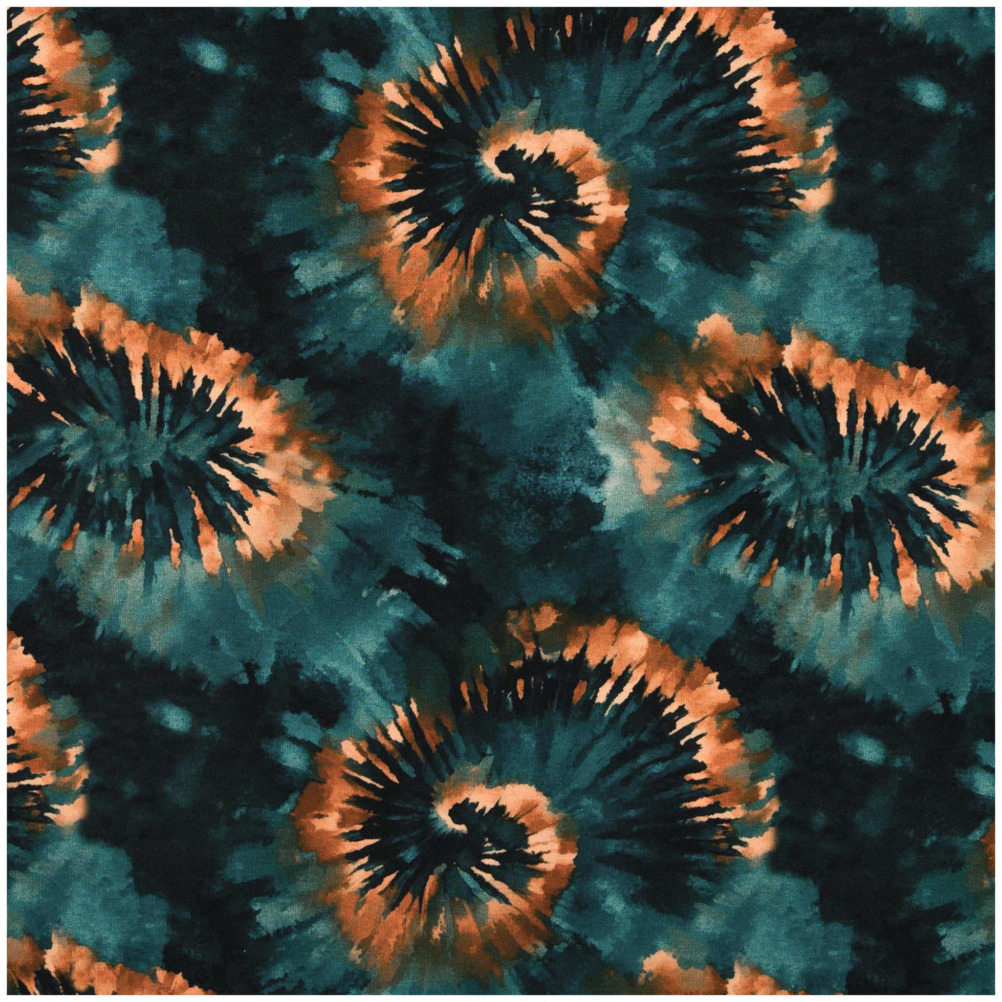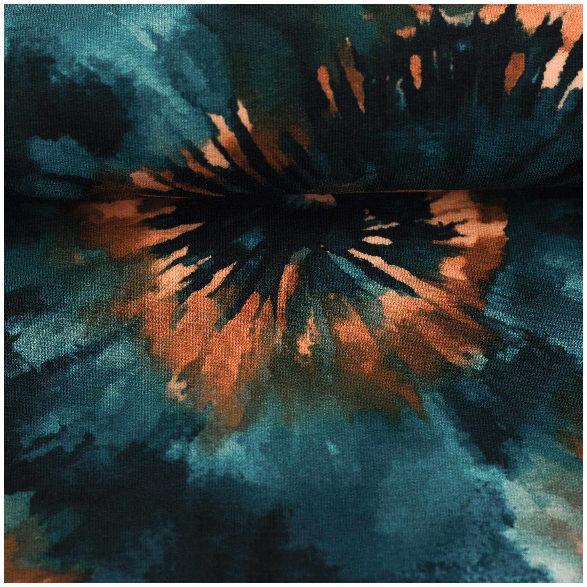Vergiss Schischi und Blümchen. Dieser French Terry ist für Projekte, die im Gedächtnis bleiben wollen. Die tiefen, fast schon düsteren Petrol-Nuancen bilden den perfekten Kontrast zu den orange-braunen Eruptionen im Tie-Dye-Look. Es sieht aus wie flüssiges Metall in Bewegung. Wenn Du diesen Stoff zuschneidest, entscheidest Du Dich bewusst gegen das Unauffällige. Jede Naht wird hier Teil eines energetischen Statements, das auf der Straße sofort heraussticht.