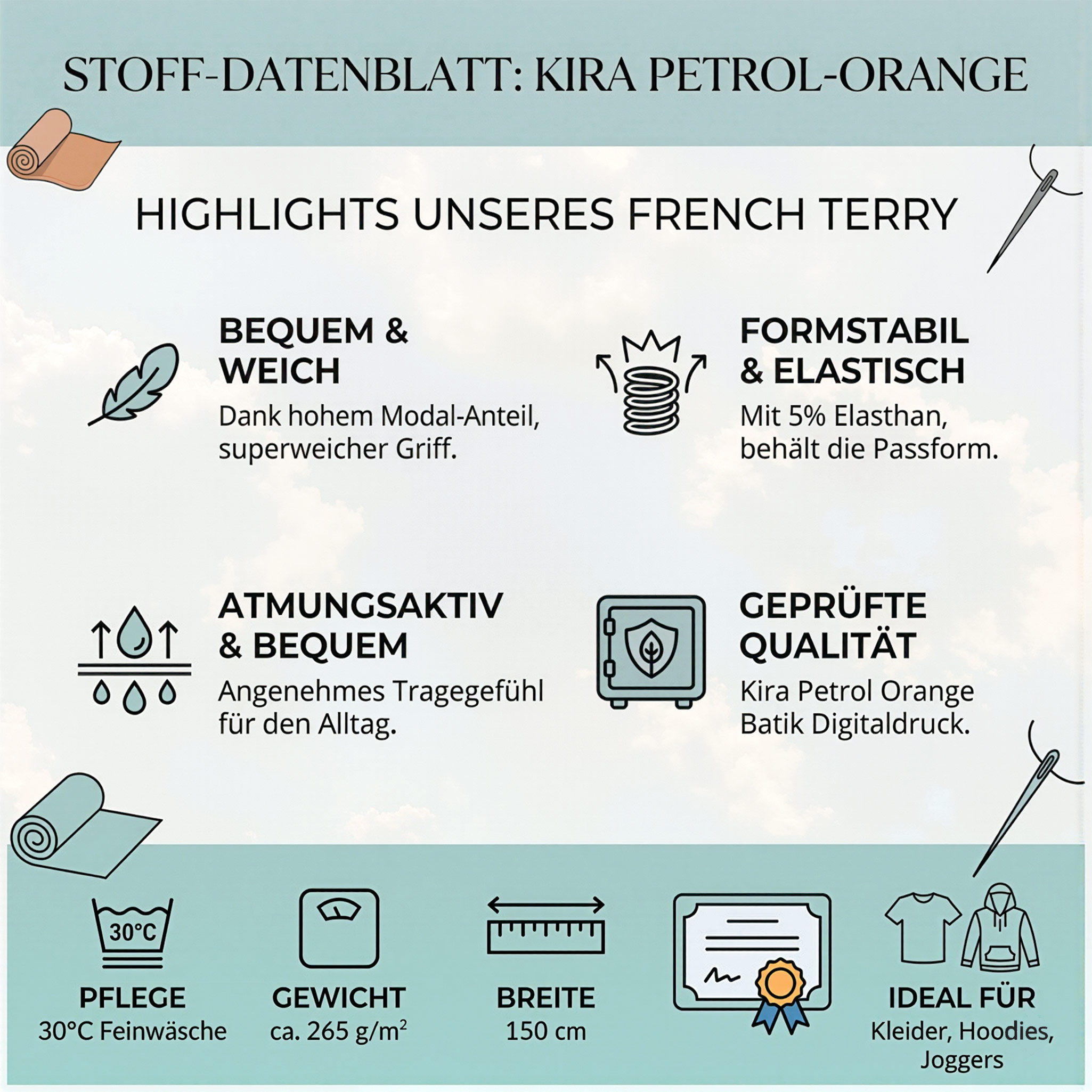 - HOCHWERTIGER MODAL-MIX: Spüre den Unterschied durch 35 % Modal-Anteil. Dieser French Terry bietet eine Geschmeidigkeit und einen fließenden Fall, den reine Baumwolle nicht erreicht. Die Mischung aus 60 % Baumwolle, 35 % Modal und 5 % Elasthan kombiniert luxuriöse Haptik mit dauerhafter Formbeständigkeit.