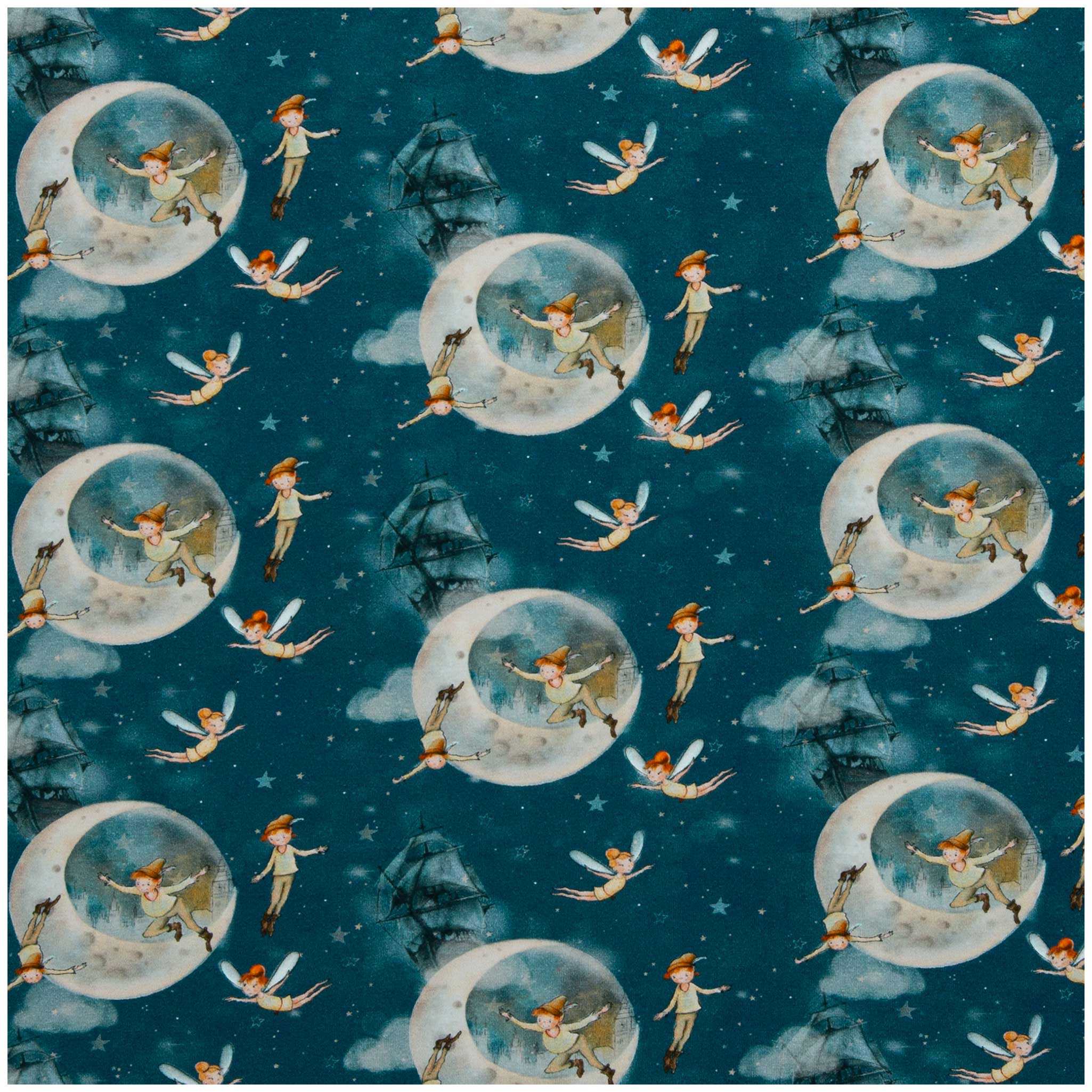 Auf tiefem Nachtblau oder zartem Himmelblau fliegen ein frecher Junge mit Zipfelmütze und eine zierliche Elfe mit Glitzerflügeln durch einen funkelnden Sternenhimmel – vorbei an geheimnisvollen Segelschiffen und silbrig leuchtenden Mondscheiben. Dieser Jersey von Swafing fängt die Magie einer unsterblichen Abenteuerwelt in einem Druck ein, der so träumerisch und warm wirkt, als wäre er direkt aus den Seiten eines alten Kinderbuchs gezaubert worden. Beide Farbvarianten – das tiefe Mitternachtsblau und das sanfte Tagesblau – haben ihren ganz eigenen Charakter und erzählen dieselbe Geschichte auf zwei völlig verschiedene Arten.