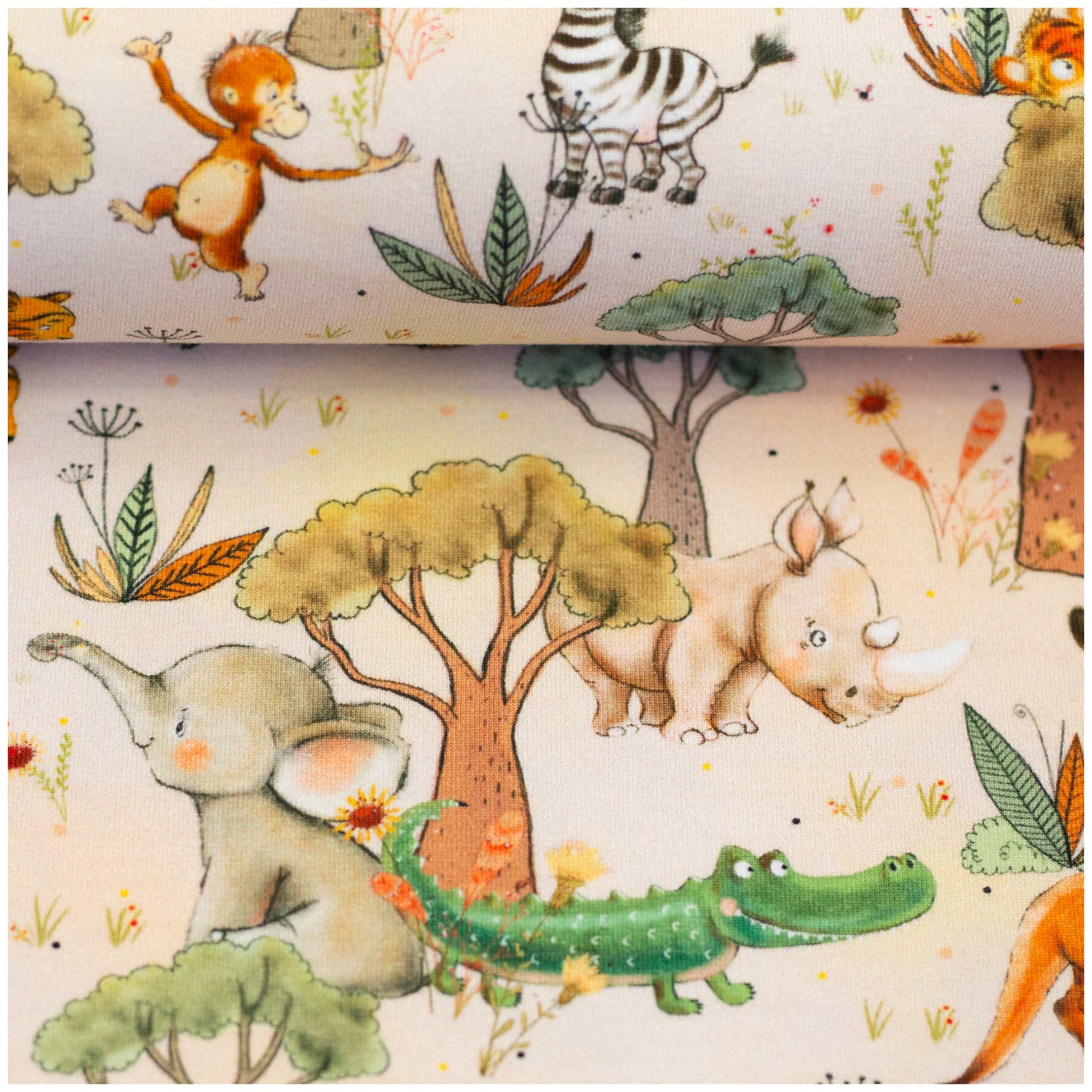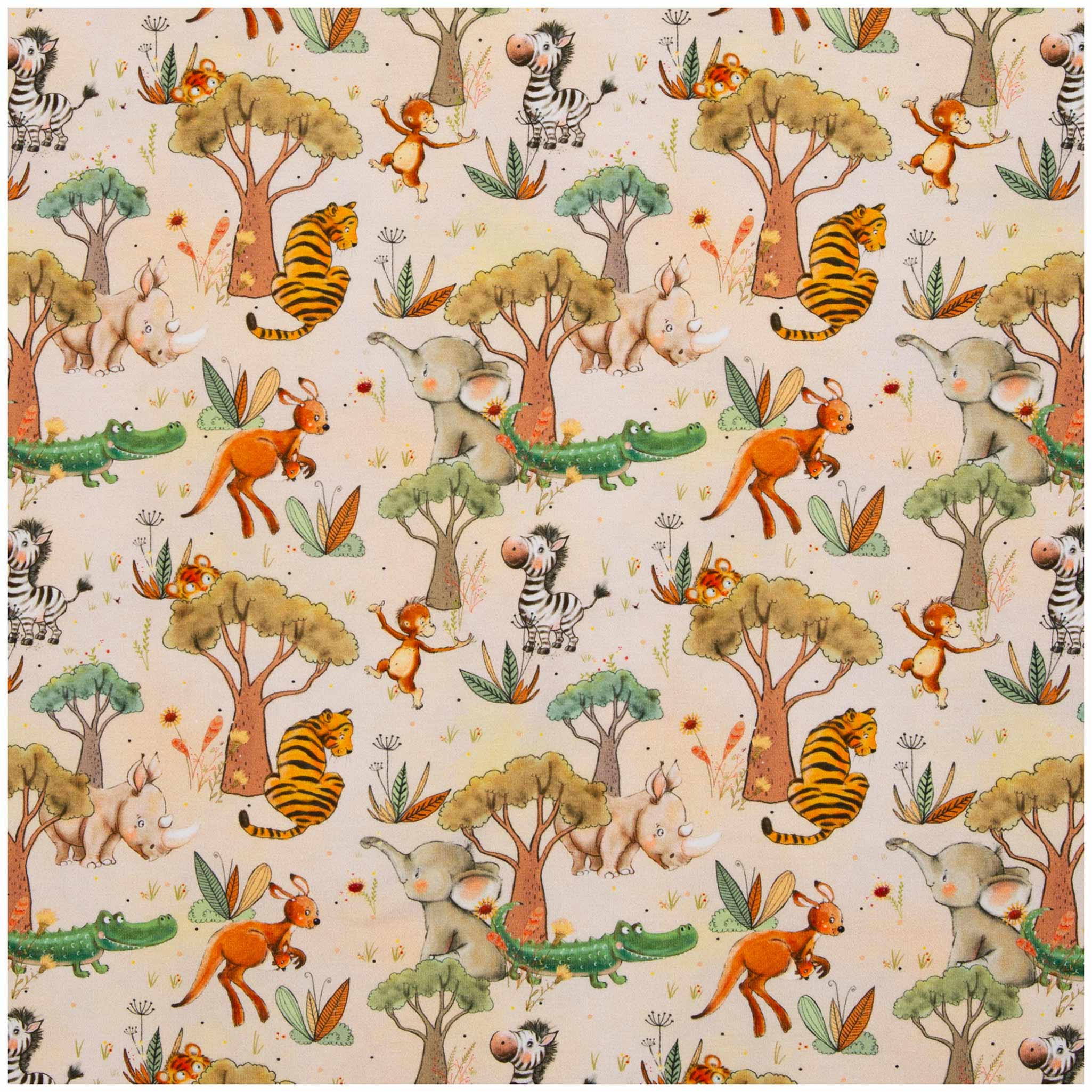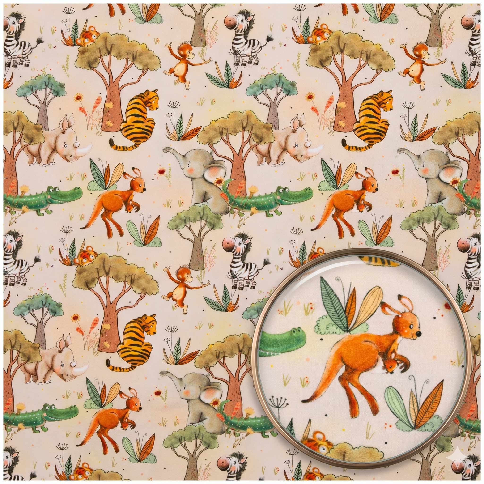 Baumwolljersey Swafing Safari Animals – Jersey Baumwollstoff (210g/m²) für Kinderhosen, Hoodies & Shirts – 1/2 Meterware mit Kängurus, Elefanten, Zebras & Nashörnern – 150cm breit – OEKO-TEX Klasse 1