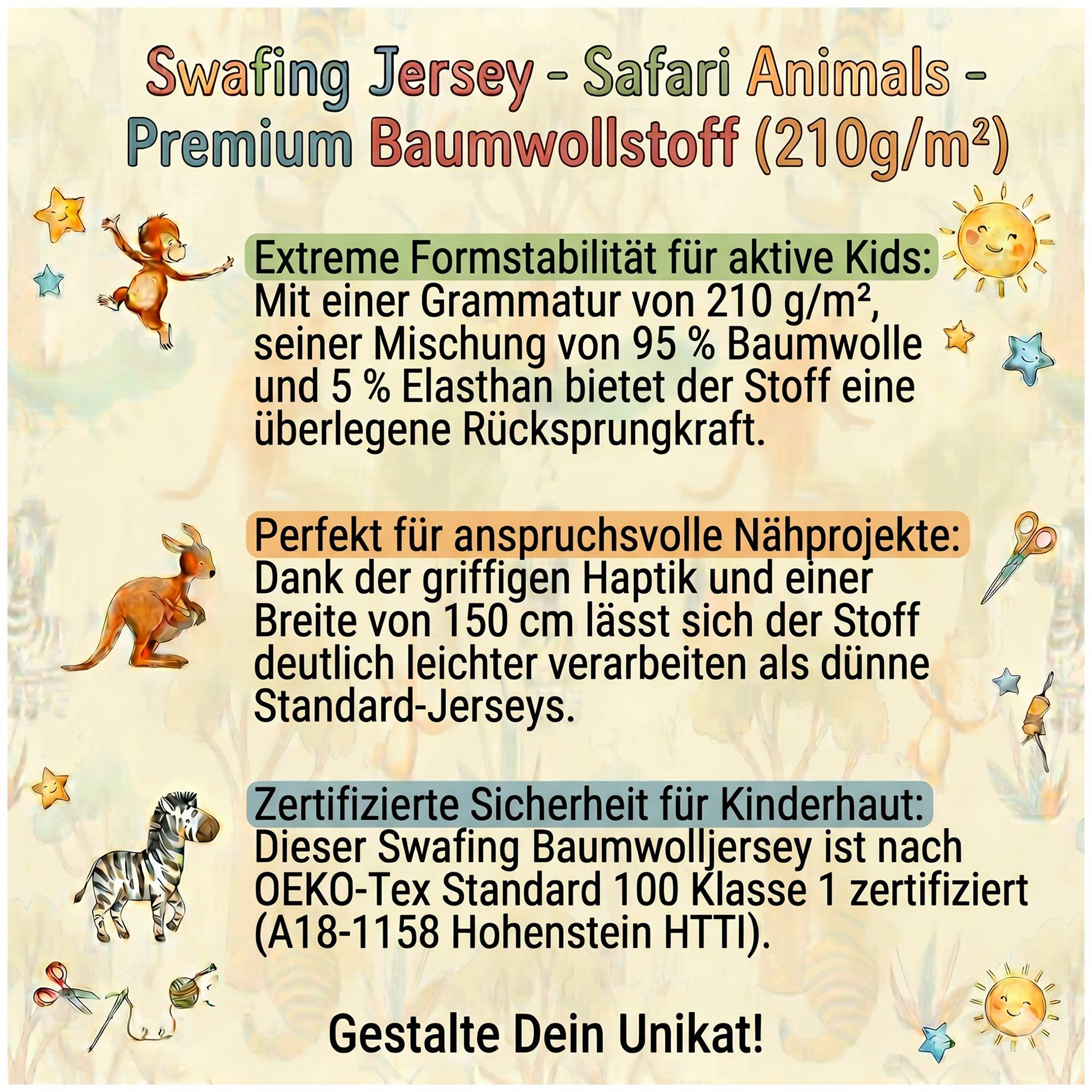 - Zertifizierte Sicherheit für Kinderhaut: Dieser Swafing Baumwolljersey ist nach OEKO-Tex Standard 100 Klasse 1 zertifiziert (A18-1158 Hohenstein HTTI). Er garantiert absolute Schadstofffreiheit, was besonders wichtig ist, wenn Kinder die Kleidung den ganzen Tag direkt auf der Haut tragen – ob im Kindergarten, in der Schule oder beim Toben.
