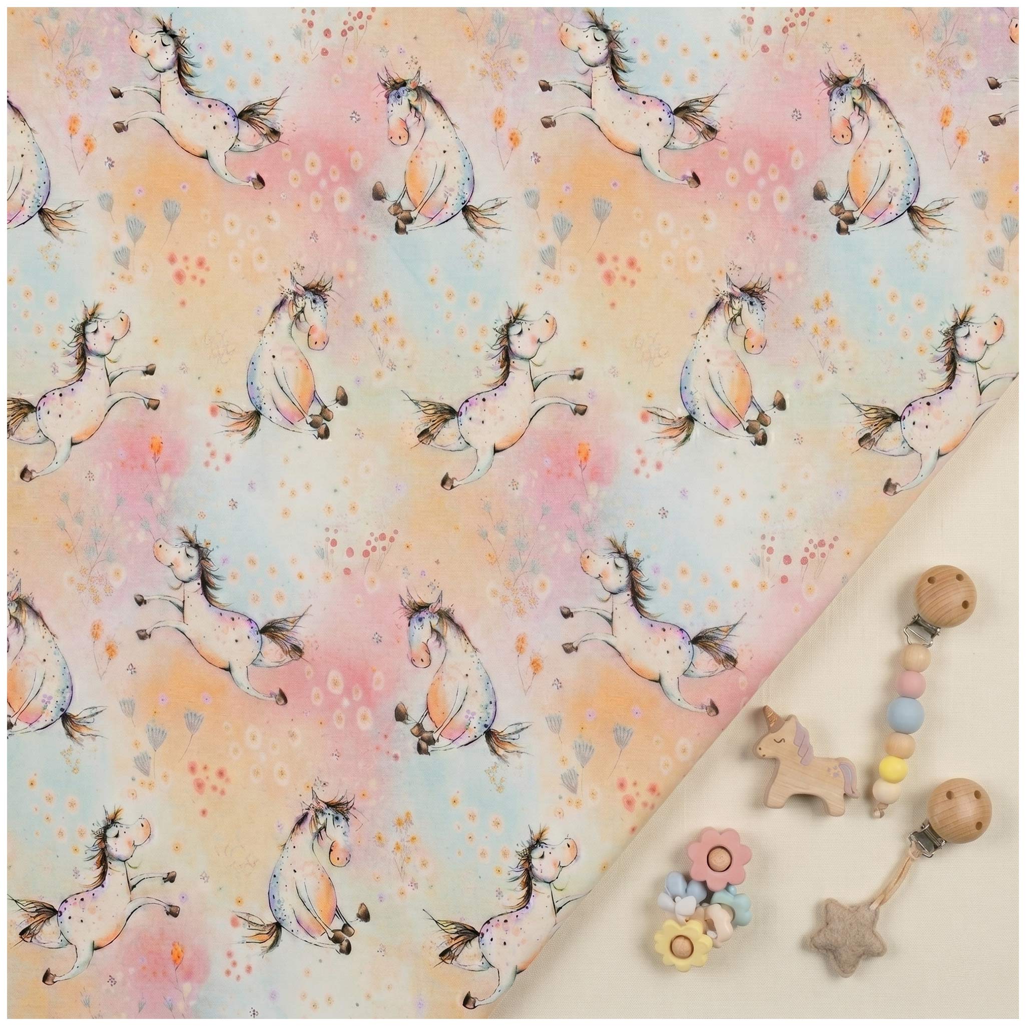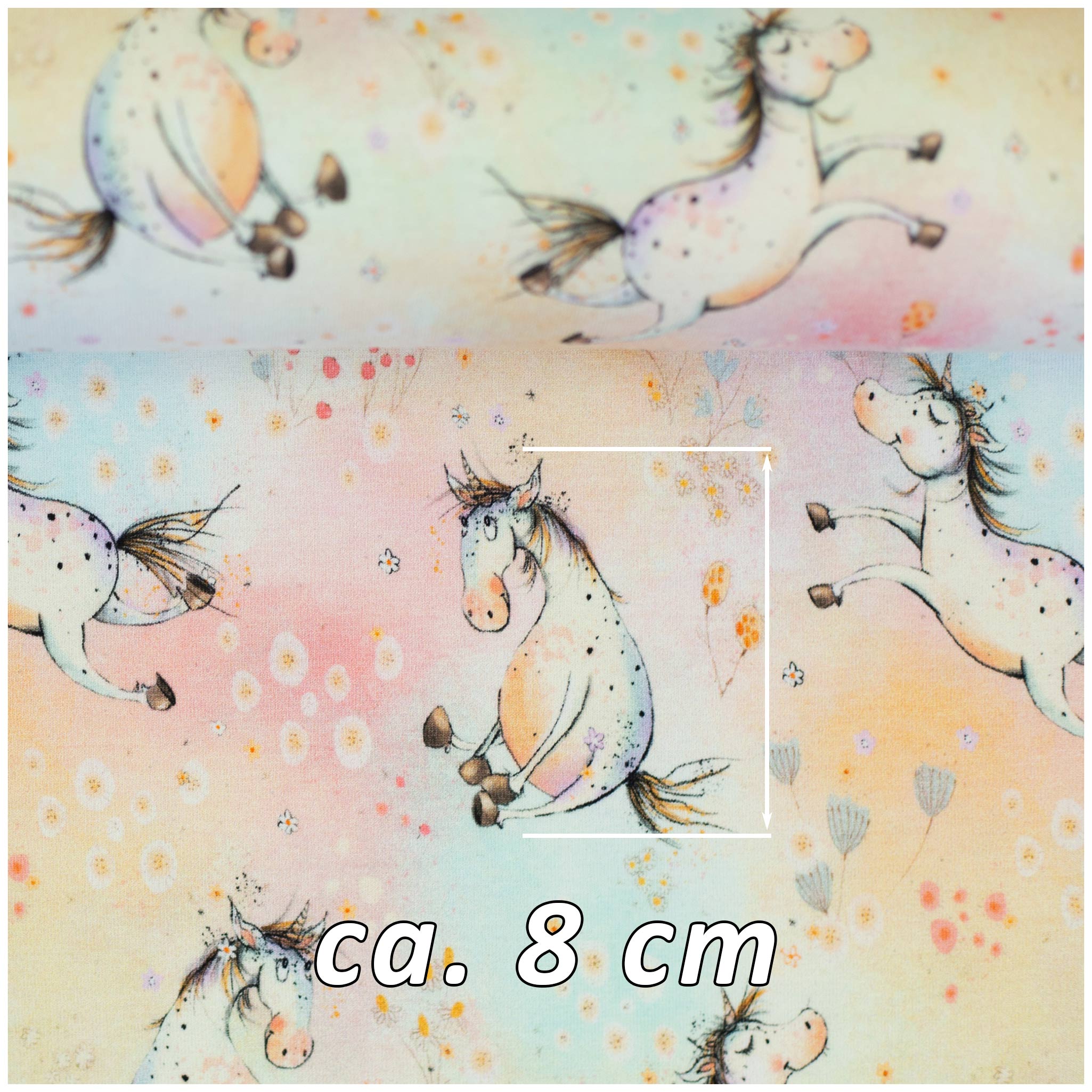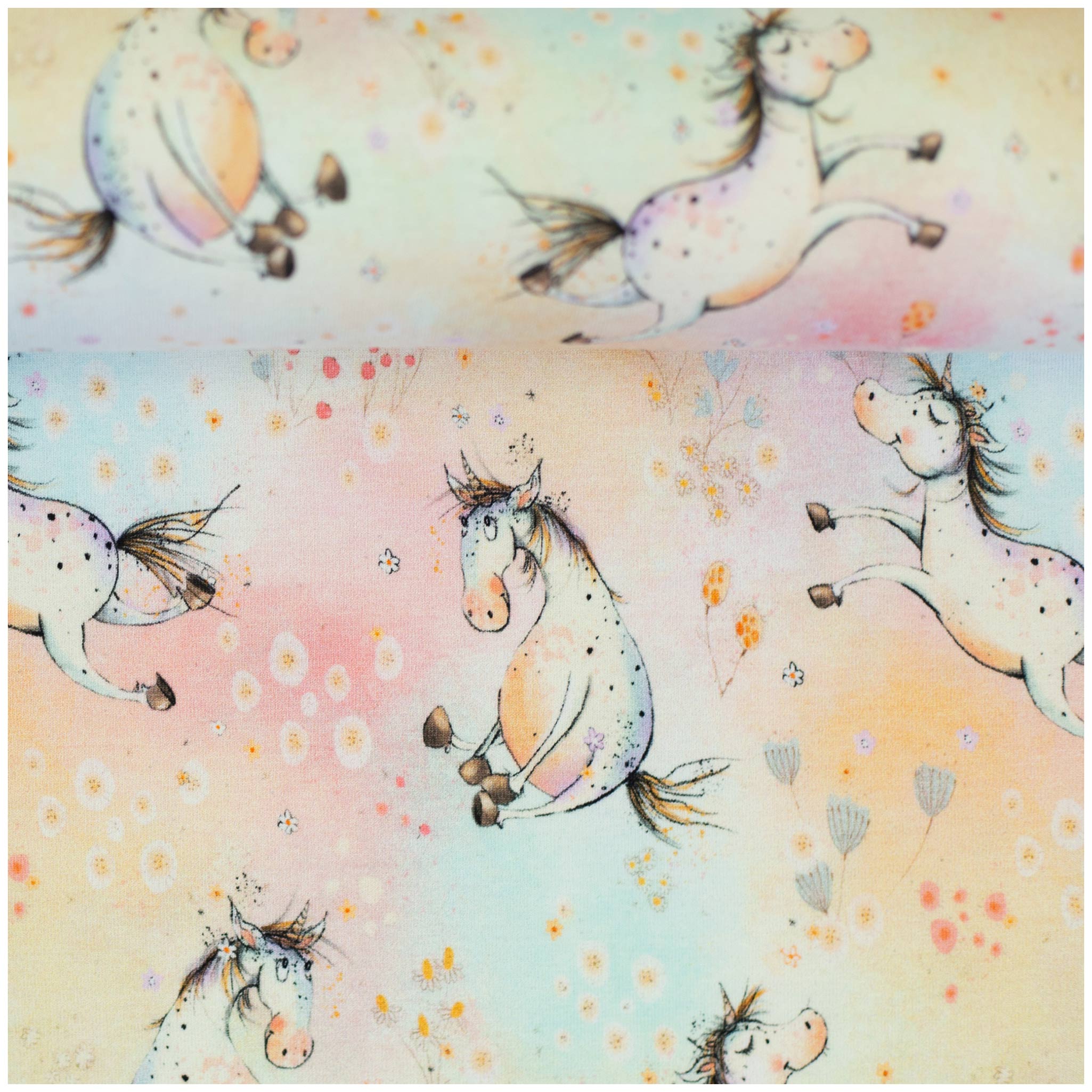 Im Zentrum dieses Designs stehen die strahlend weißen Einhörner, die mit ihrer stolzen Silhouette sofort die Fantasie wecken. Es sind diese kleinen Details in den Mähnen, die das Herz höherschlagen lassen und jedes genähte Stück zu einem echten Unikat machen. Der Hintergrund hält sich dabei dezent zurück: Sanfte Regenbogenwellen in pudrigen Pastelltönen fließen ruhig über den Stoff und bilden eine harmonische Bühne für die Fabelwesen. So entsteht ein Look, der verspielt und dennoch modern wirkt – perfekt für alle, die ihren Liebsten eine Welt voller Magie und Sanftheit schenken möchten.