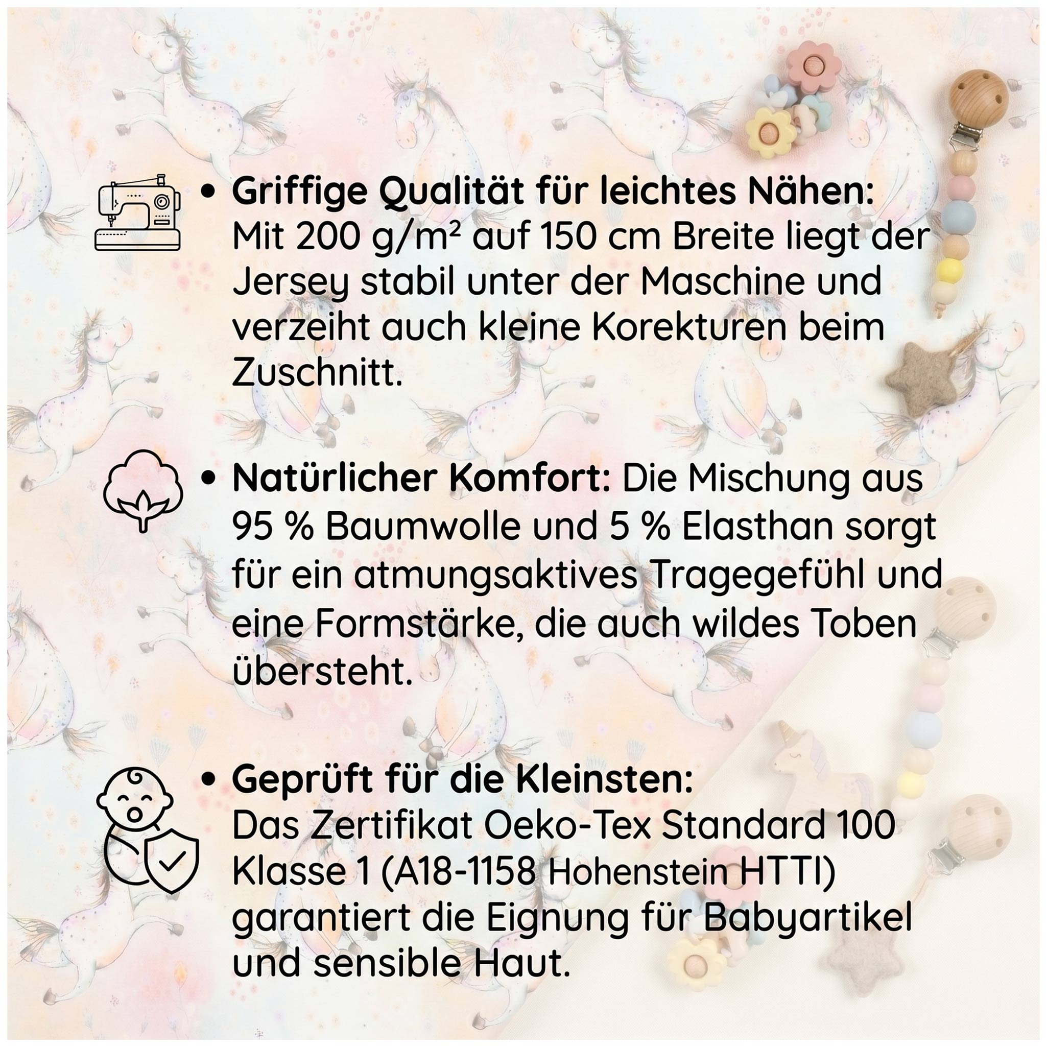 - Geprüfte Sicherheit für sensible Haut: Da bei Textilien für Kinder keine Kompromisse eingegangen werden dürfen, ist dieser Stoff nach dem strengen Oeko-Tex Standard 100 in der Produktklasse 1 (A18-1158 Hohenstein HTTI) zertifiziert. Diese höchste Zertifizierungsstufe garantiert, dass das Material umfassend schadstoffgeprüft und somit bedenkenlos für die Herstellung von Baby- und Kleinkindartikeln geeignet ist – für ein sicheres Gefühl direkt auf der Haut.
