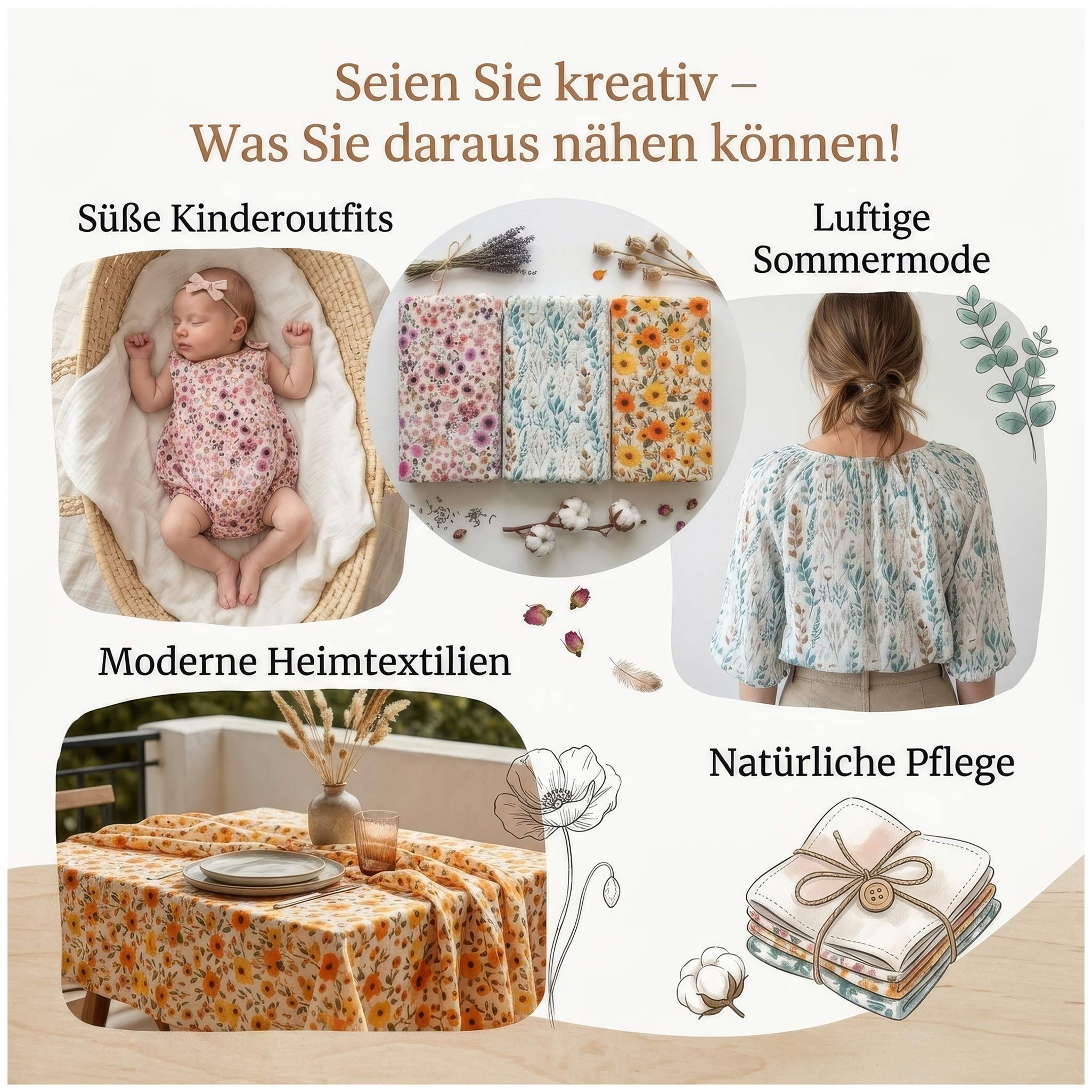 - ERSTKLASSIGE QUALITÄT: Dieser Musselin besteht aus 100 % reiner Baumwolle in doppellagiger Webung. Er ist herrlich weich, atmungsaktiv und feuchtigkeitsregulierend – ideal für empfindliche Haut und warme Sommertage.