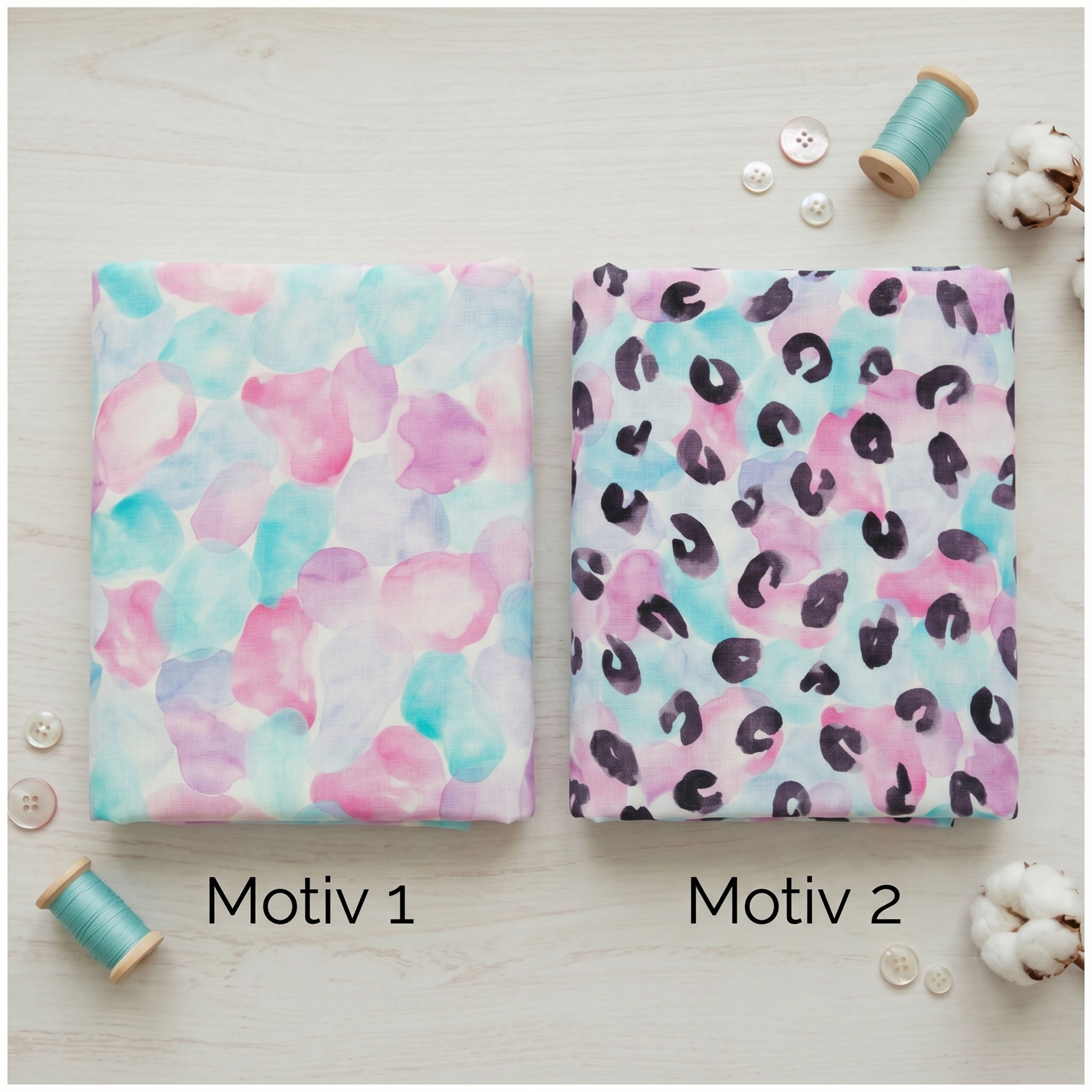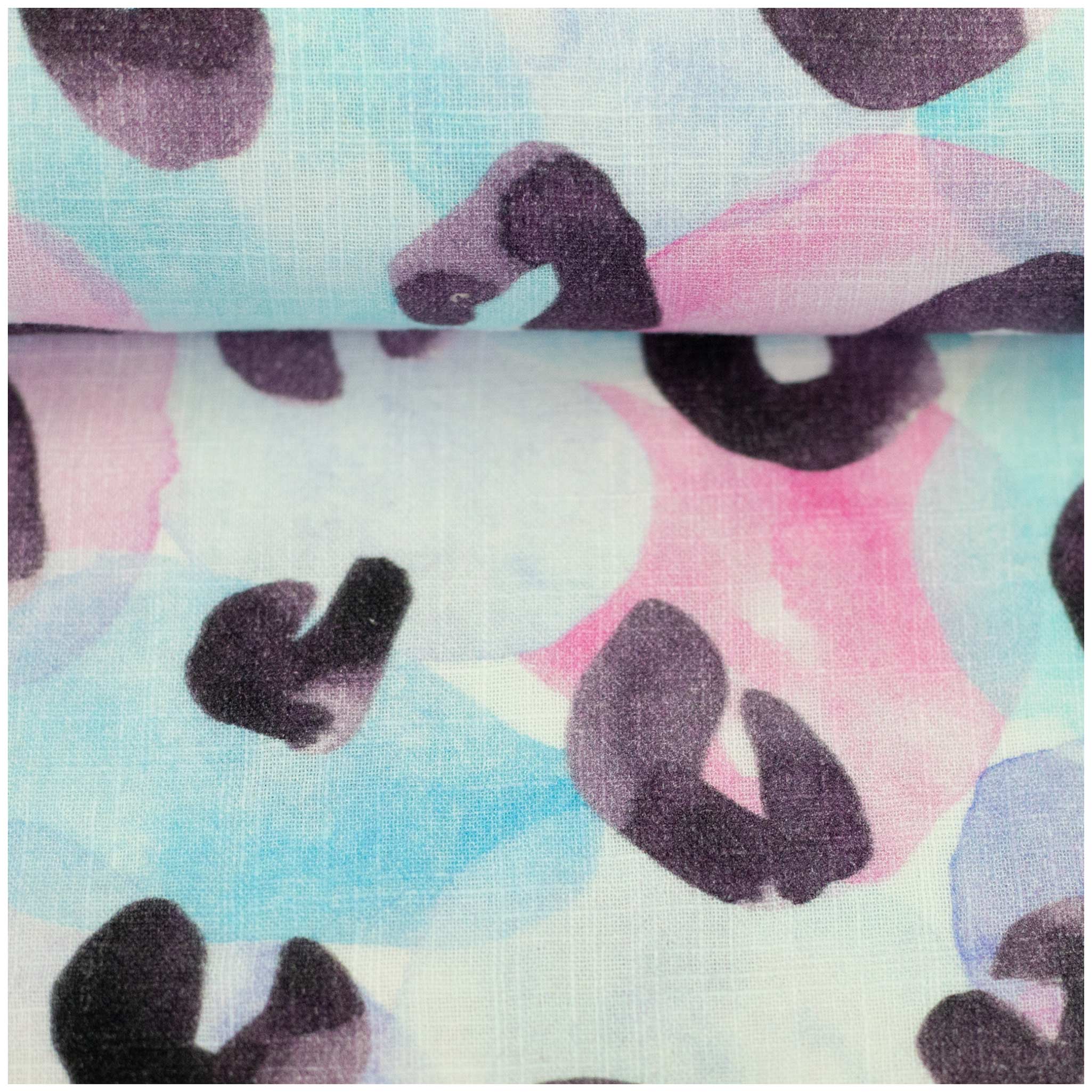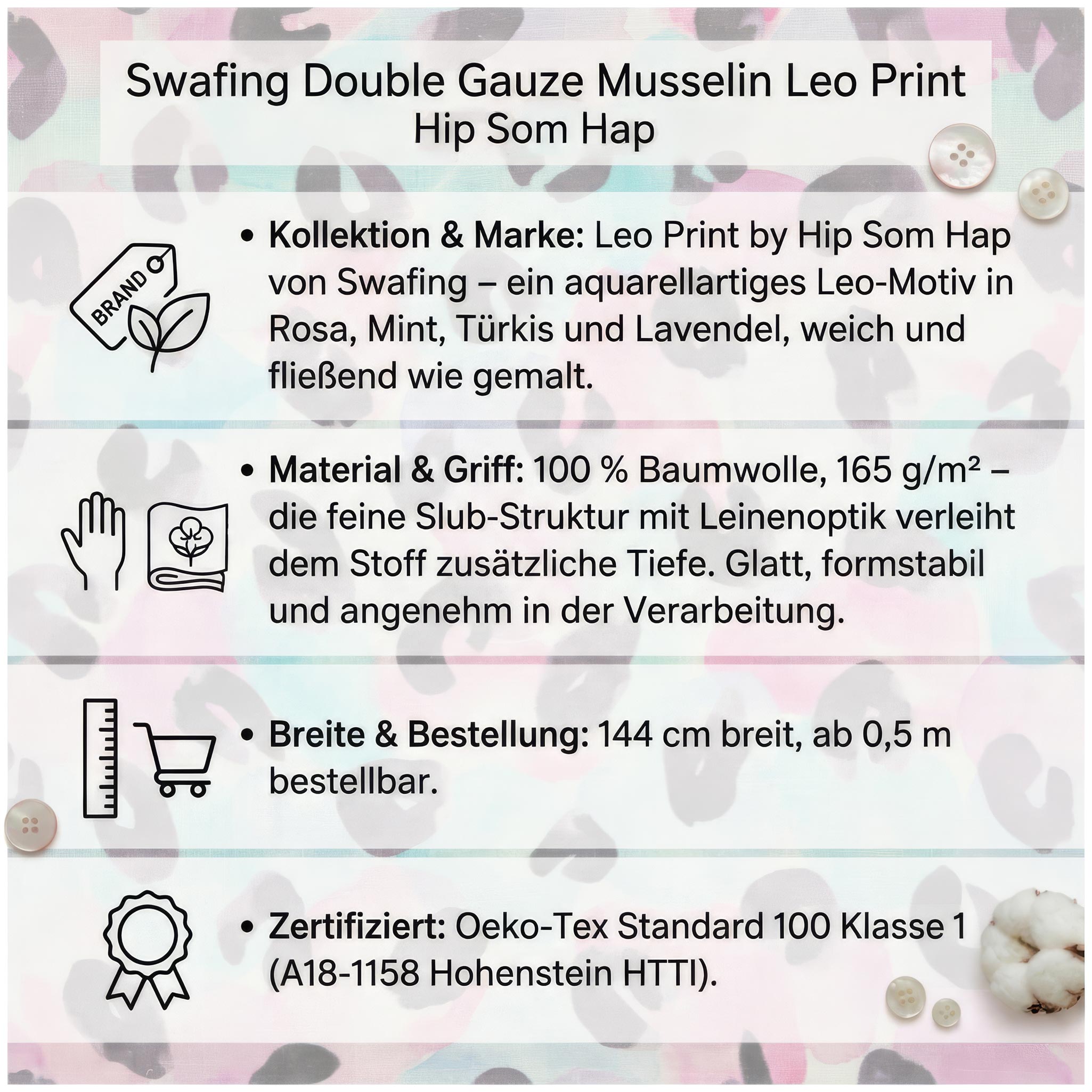 - Kollektion & Marke: Leo Print by Hip Som Hap von Swafing – ein aquarellartiges Leo-Motiv in Rosa, Mint, Türkis und Lavendel, weich und fließend wie gemalt.