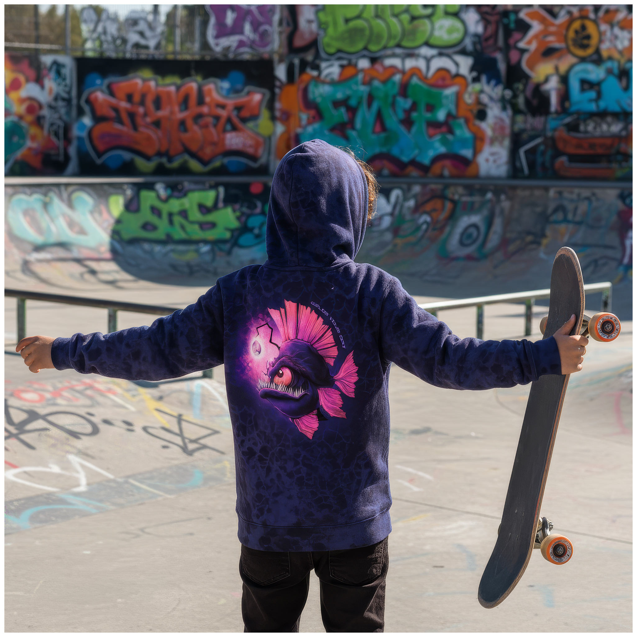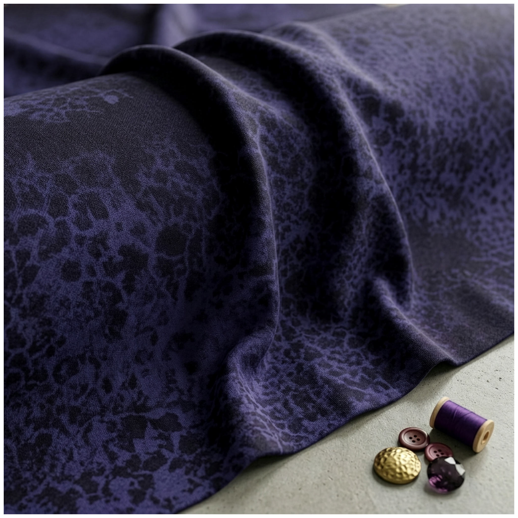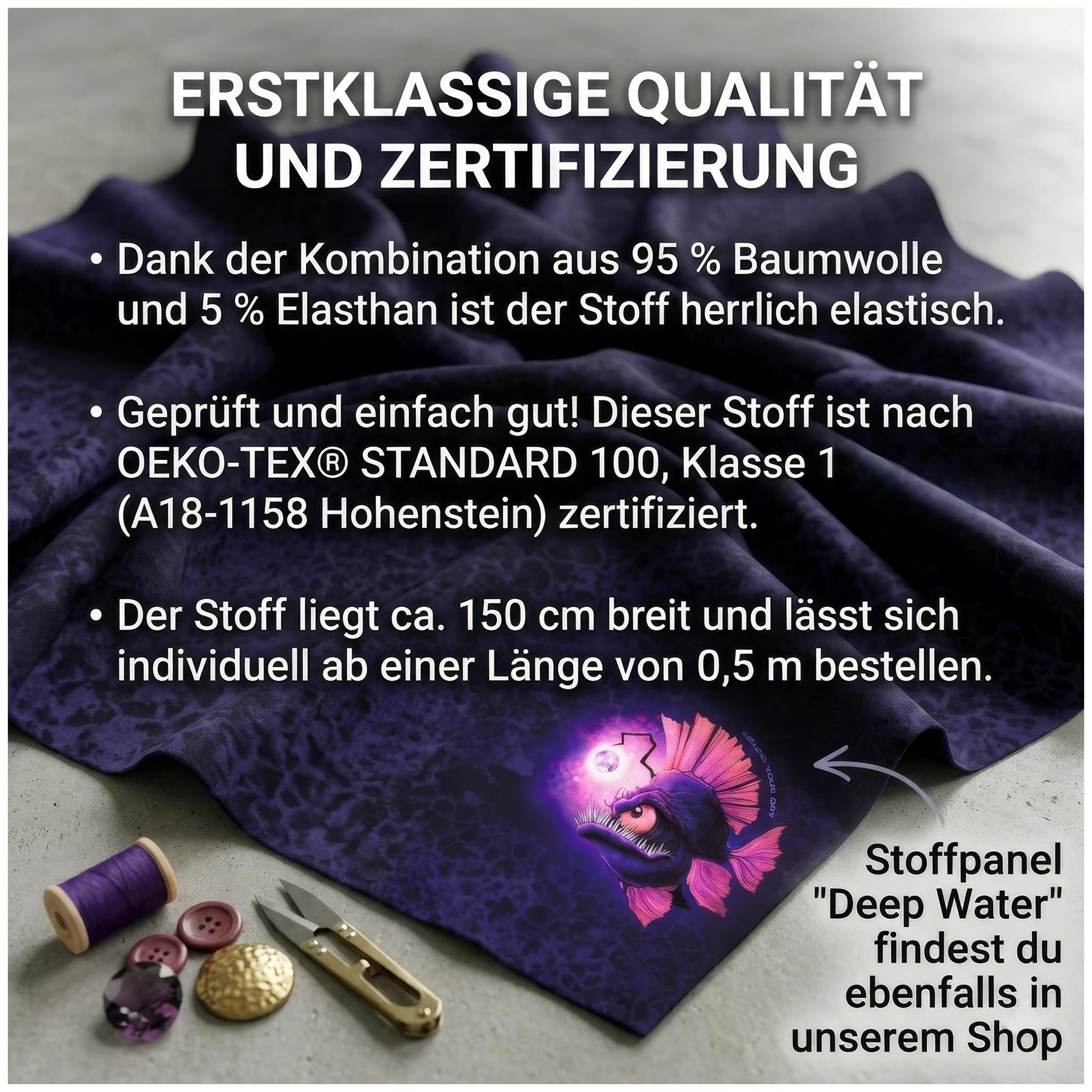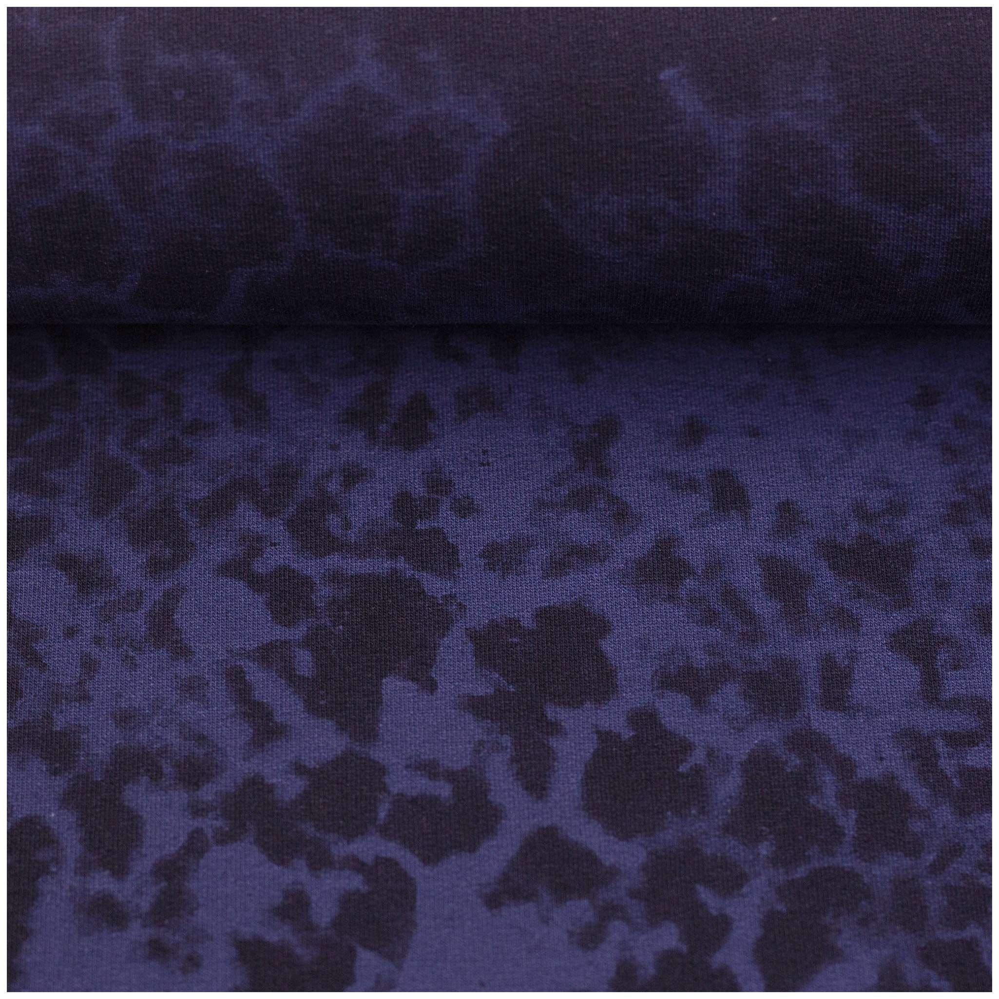 Tauche ab in dein nächstes Nähprojekt! Dieser hochwertige French Terry ist der ideale Partner für dein „Deep Water“-Panel. Mit seinem künstlerischen Design im blau-schwarzen Batiklook greift der Stoff die geheimnisvollen Nuancen des Hauptmotivs perfekt auf und sorgt für einen absolut stimmigen Look bei deinen Nähprojekten.