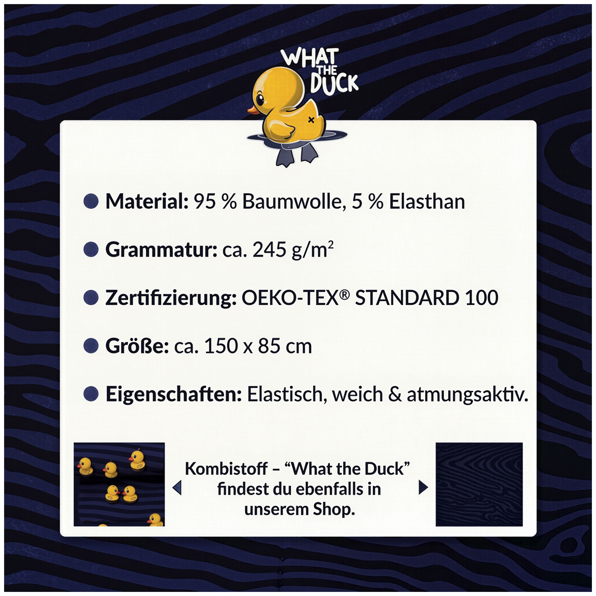 - EXKLUSIVES DESIGNER-MOTIV: Setze modische Statements mit dem „What the Duck“-Motiv von Thorsten Berger. Die Kombination aus coolen, gelben Quietscheentchen und einem witzigen Spruch macht jedes Nähprojekt zum absoluten Blickfang.